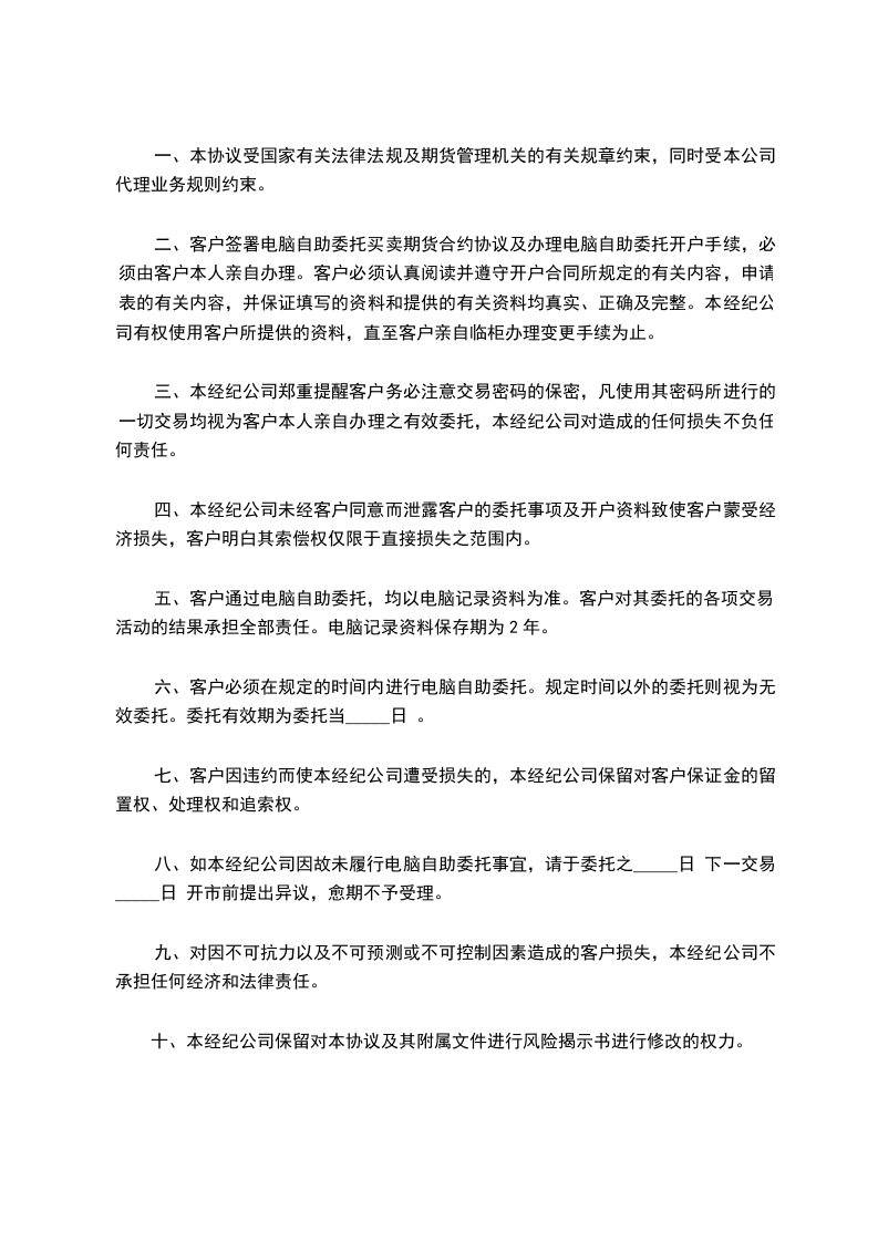 十五、本协议一式二份。为本公司《合同文件》的有效组成部分,由客户和期货经纪公司授权人签章后即生效。客户和本经纪公司各执一份,均具有同等法律效力。