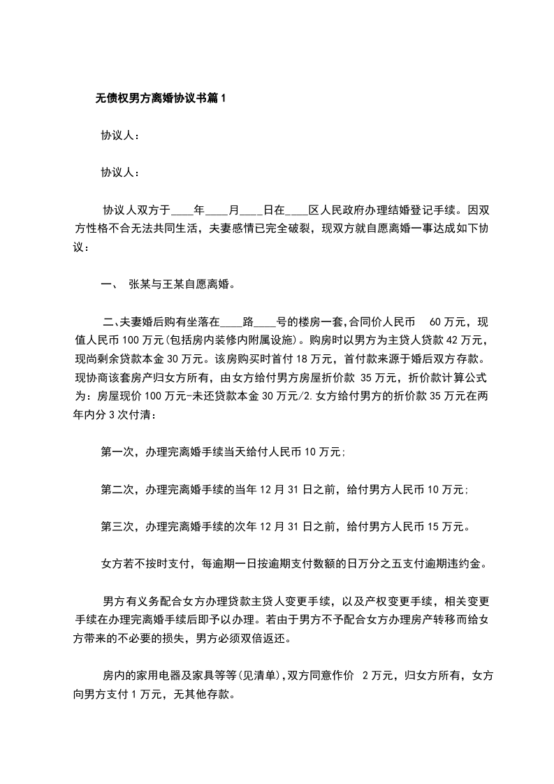 无债权男方离婚协议书篇1
