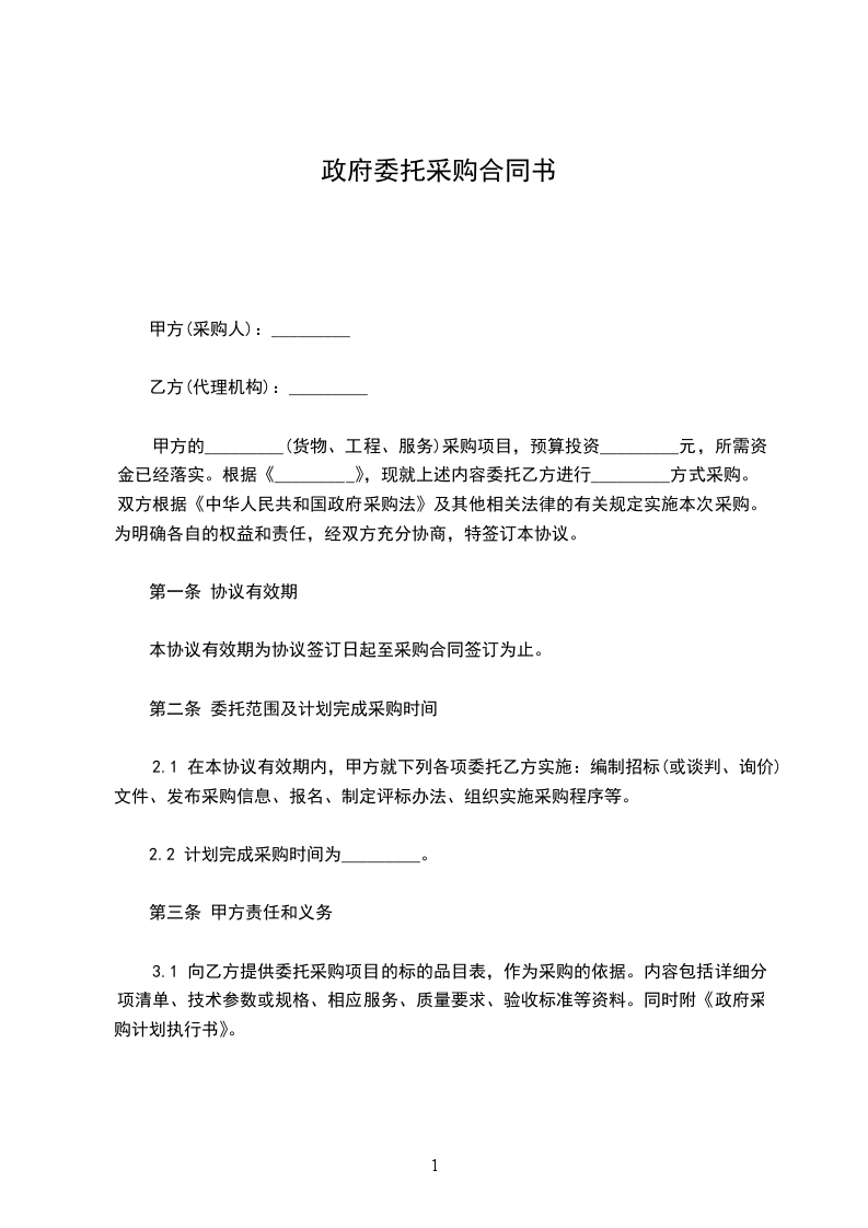 甲方的_________(货物、工程、服务)采购项目,预算投资_________元,所需资金已经落实。根据《_________》,现就上述内容委托乙方进行_________方式采购。双方根据《中华人民共和国政府采购法》及其他相关法律的有关规定实施本次采购。为明确各自的权益和责任,经双方充分协商,特签订本协议。