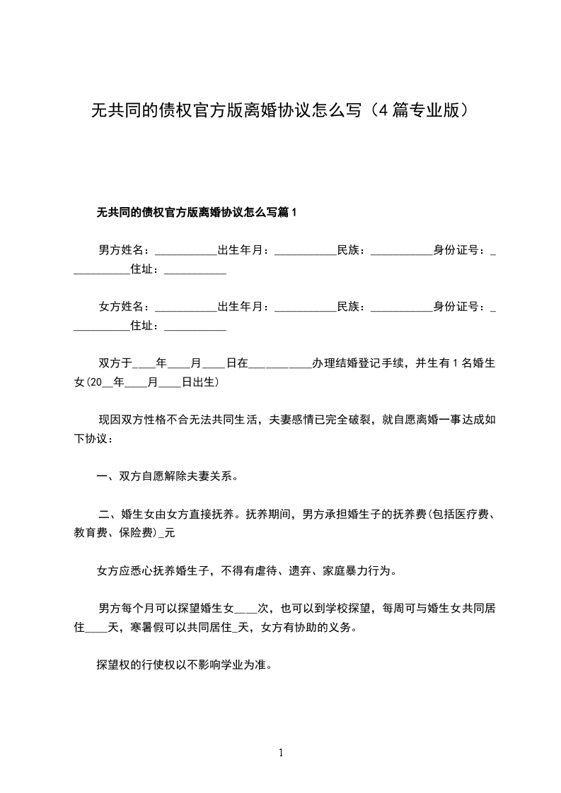 无共同的债权官方版离婚协议怎么写篇1