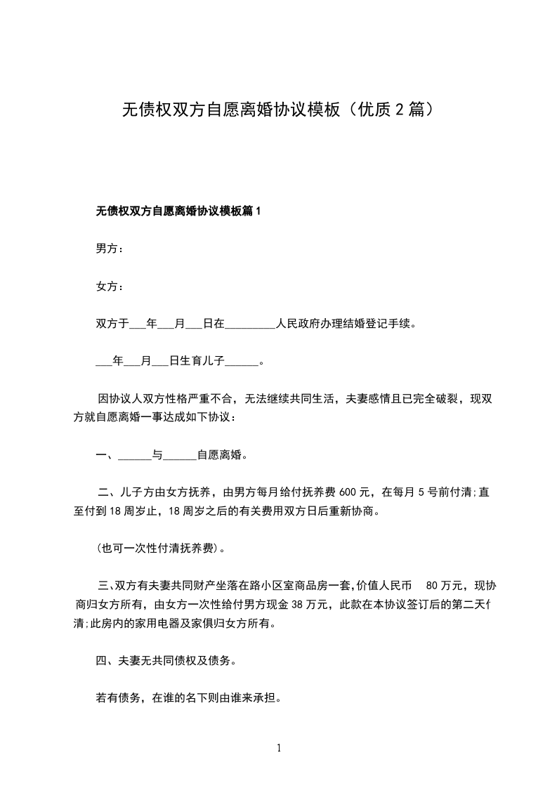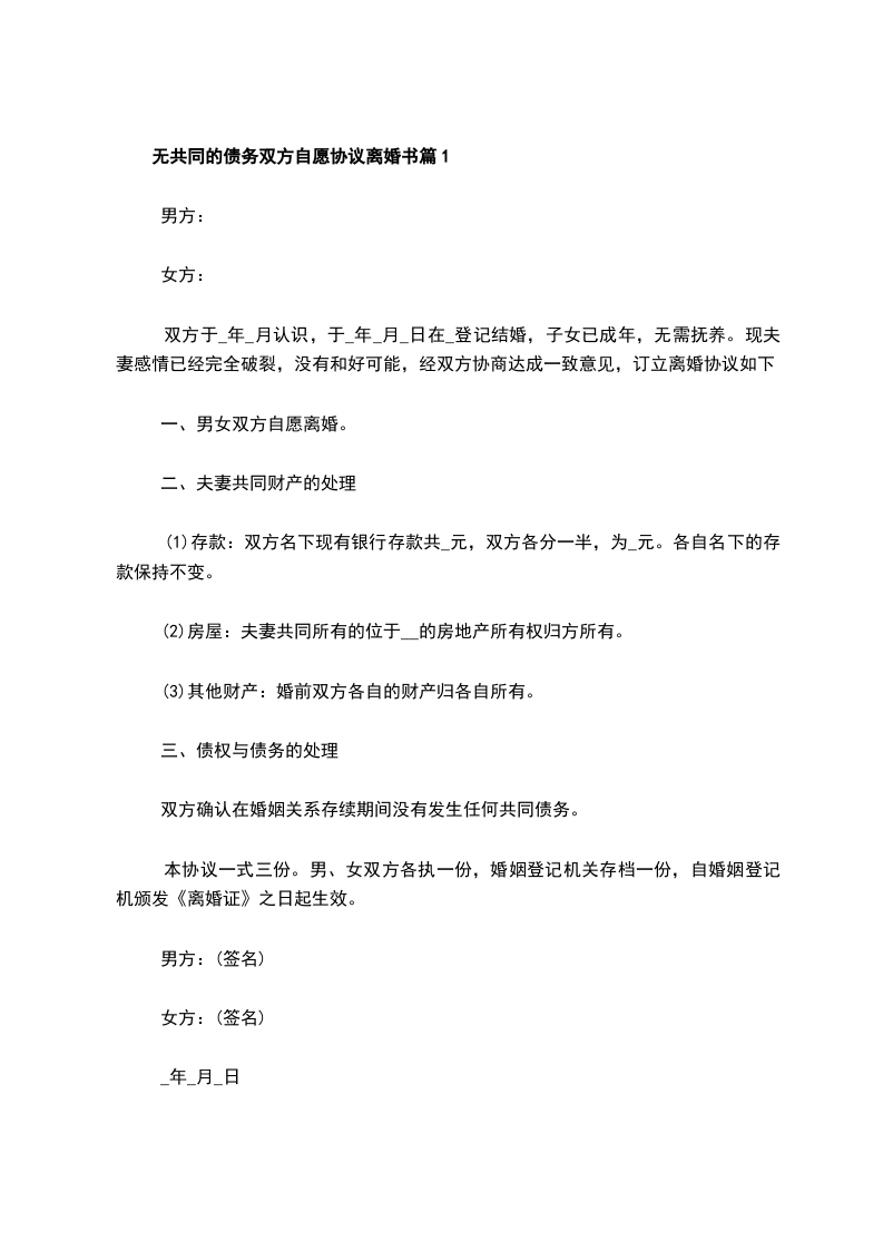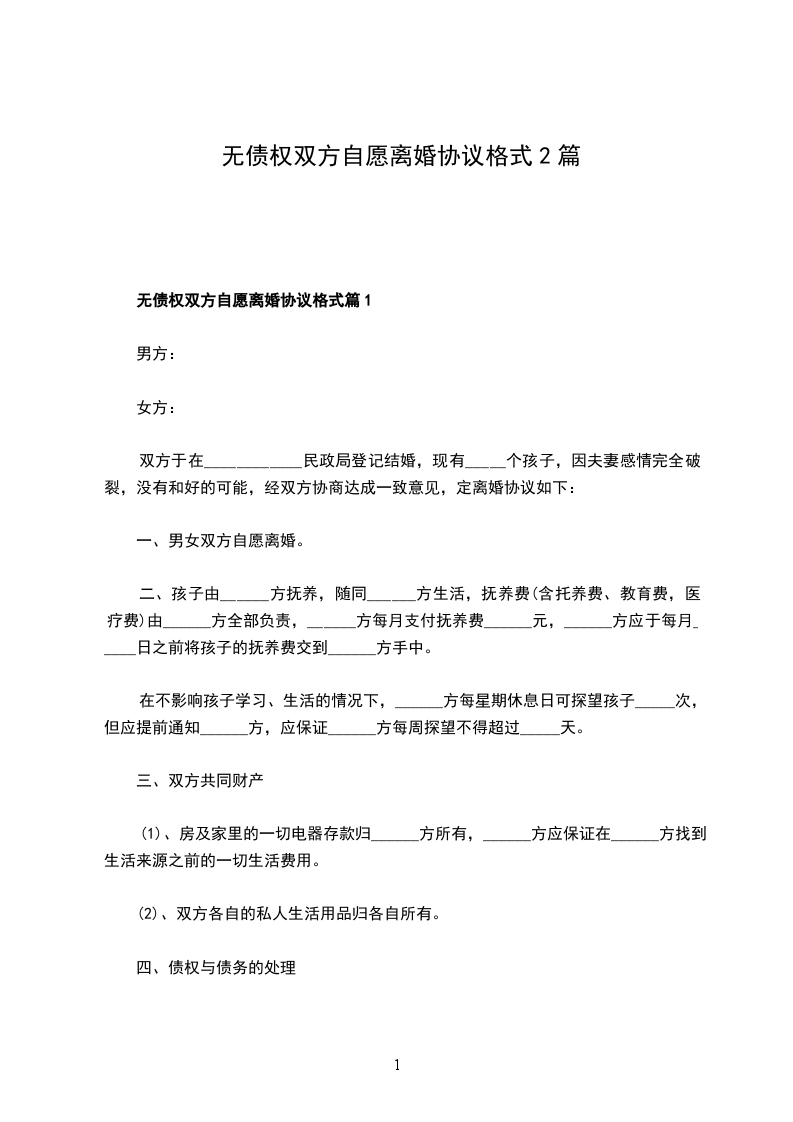 无债权双方自愿离婚协议格式篇1