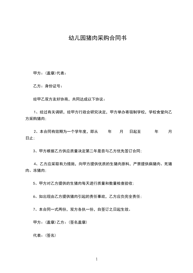 1、经过有关调研,经甲方行政会研究决定,甲方举办寄宿制学校,学校食堂向乙方采购猪肉;