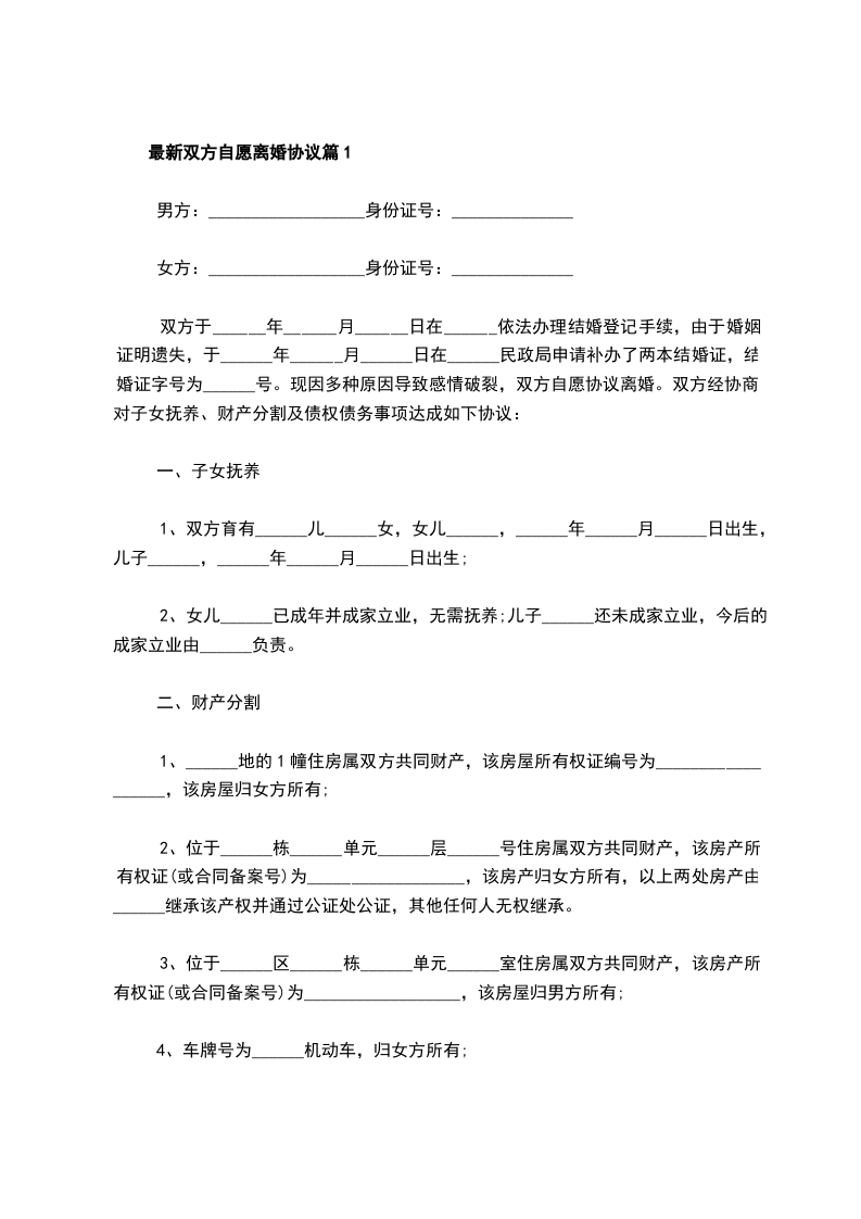 最新双方自愿离婚协议篇1