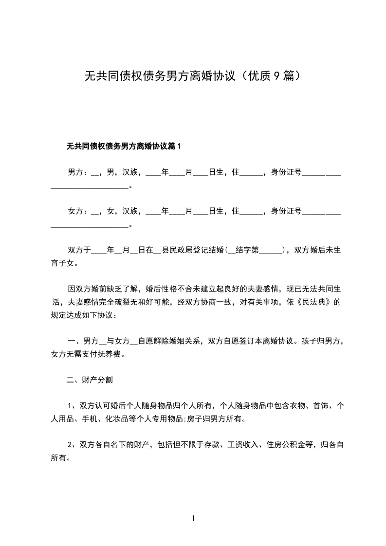 男方与女方于_________年_________月_________日在_________省登记结婚。双方夫妻感情确已破裂,已无和好可能,双方自愿离婚。现根据《民法典》的有关规定,经男女双方自愿协商,达成协议如下: