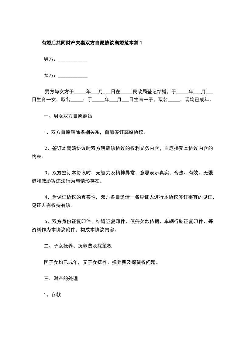 有婚后共同财产夫妻离婚协议如何写篇9