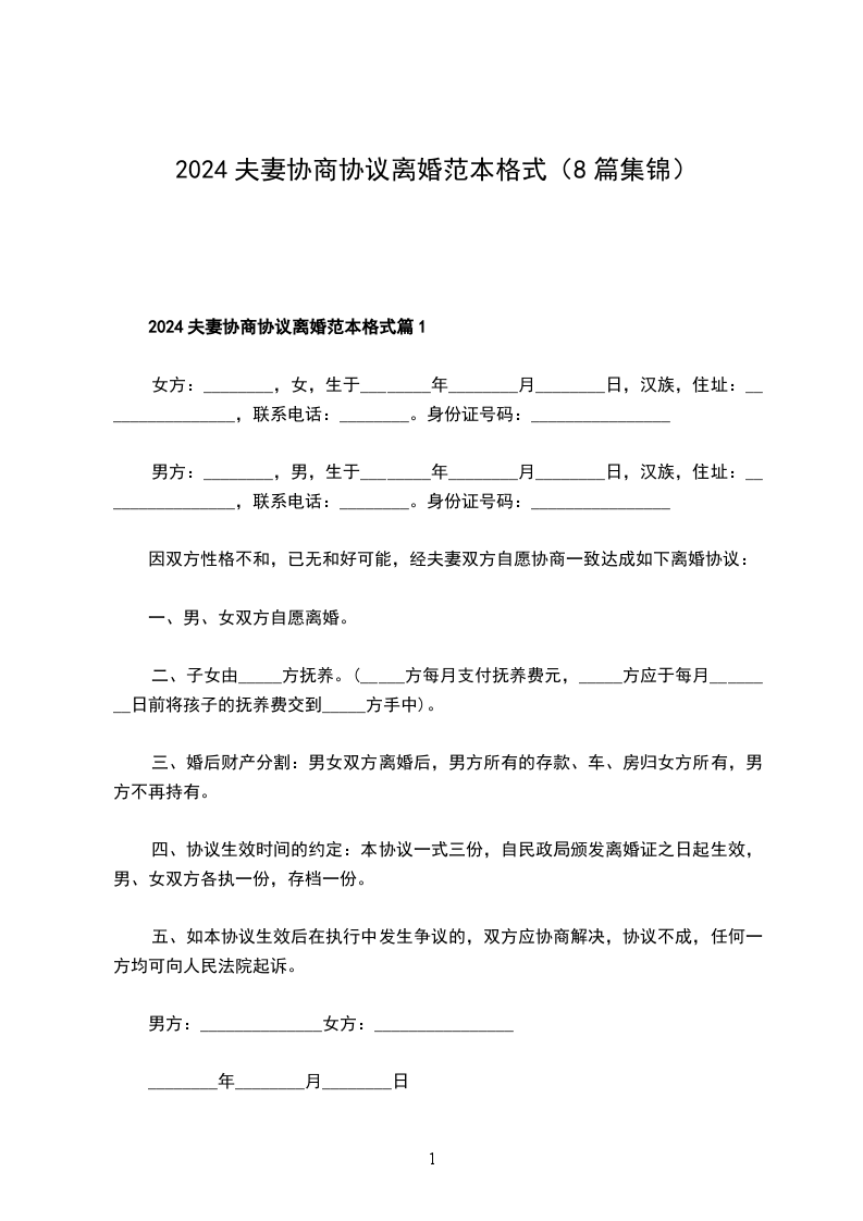 2024夫妻协商协议离婚范本格式篇1