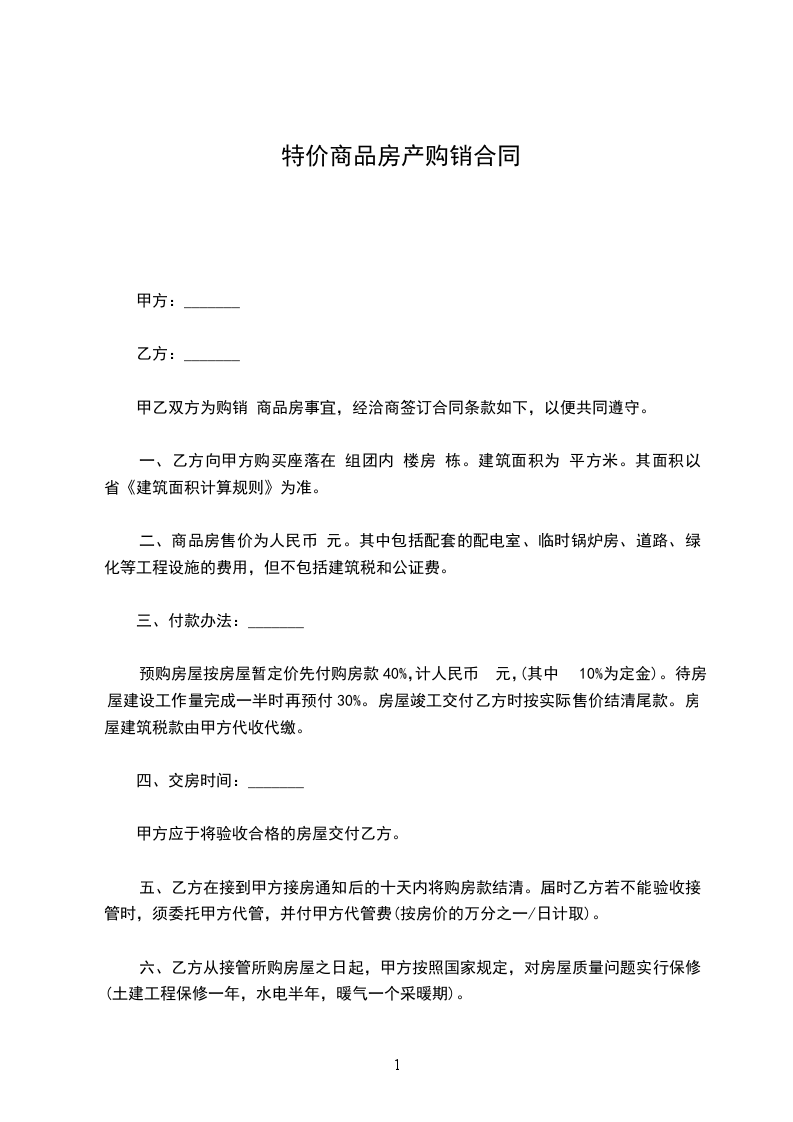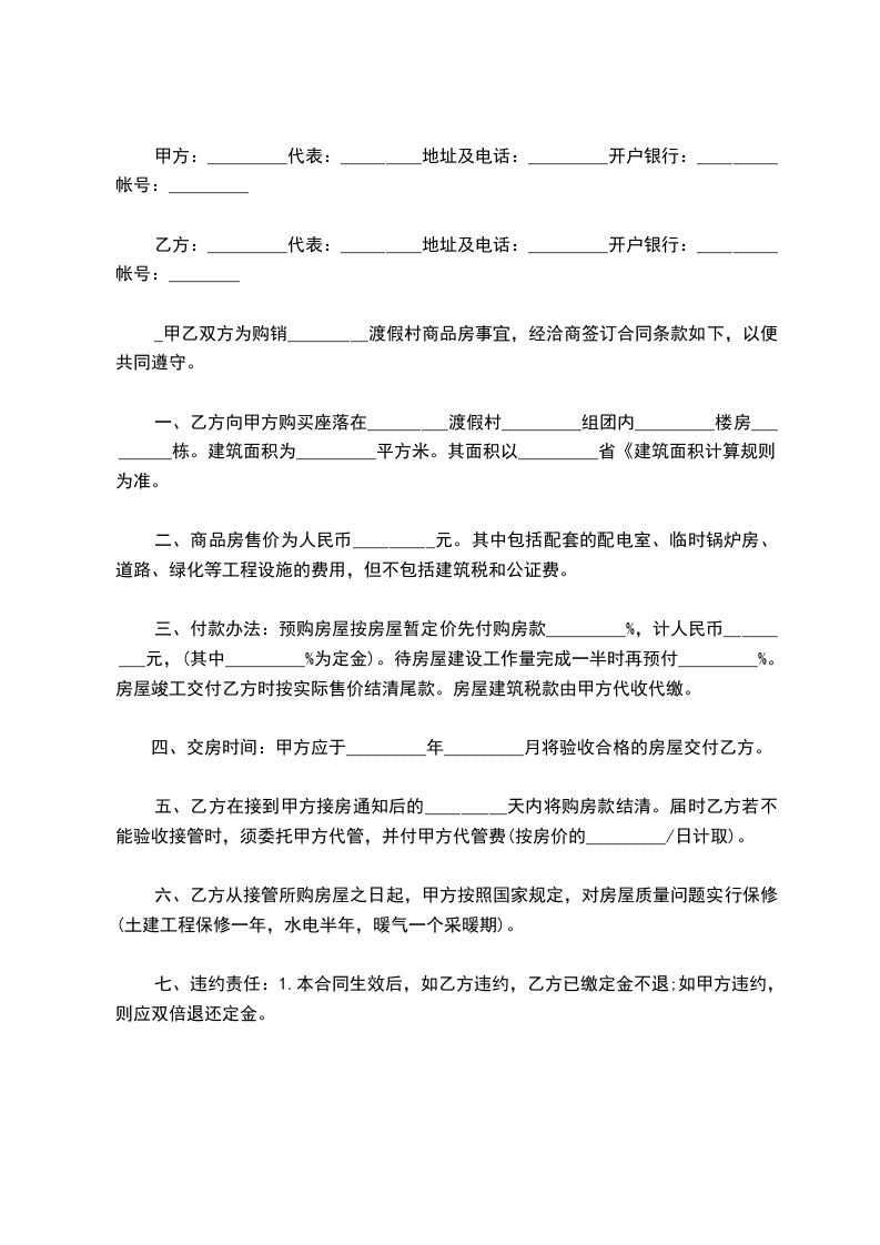 一、乙方向甲方购买座落在____渡假村____组团内____楼房____栋。建筑面积为____平方米。其面积以____省《建筑面积计算规则》为准。