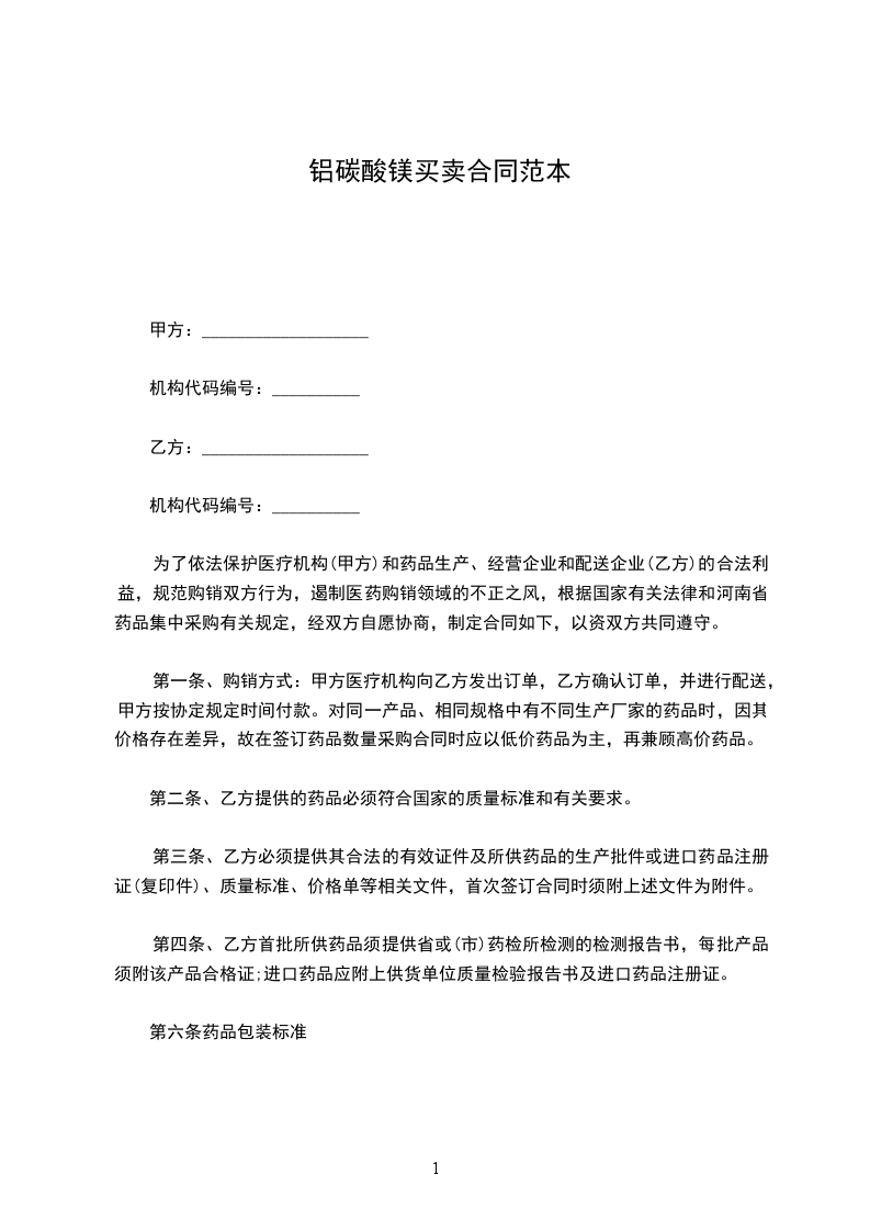 为了依法保护医疗机构(甲方)和药品生产、经营企业和配送企业(乙方)的合法利益,规范购销双方行为,遏制医药购销领域的不正之风,根据国家有关法律和河南省药品集中采购有关规定,经双方自愿协商,制定合同如下,以资双方共同遵守。