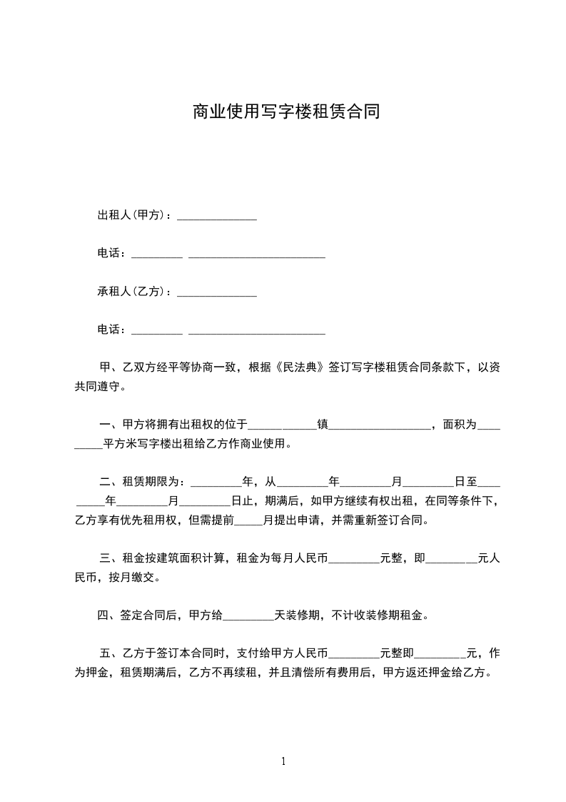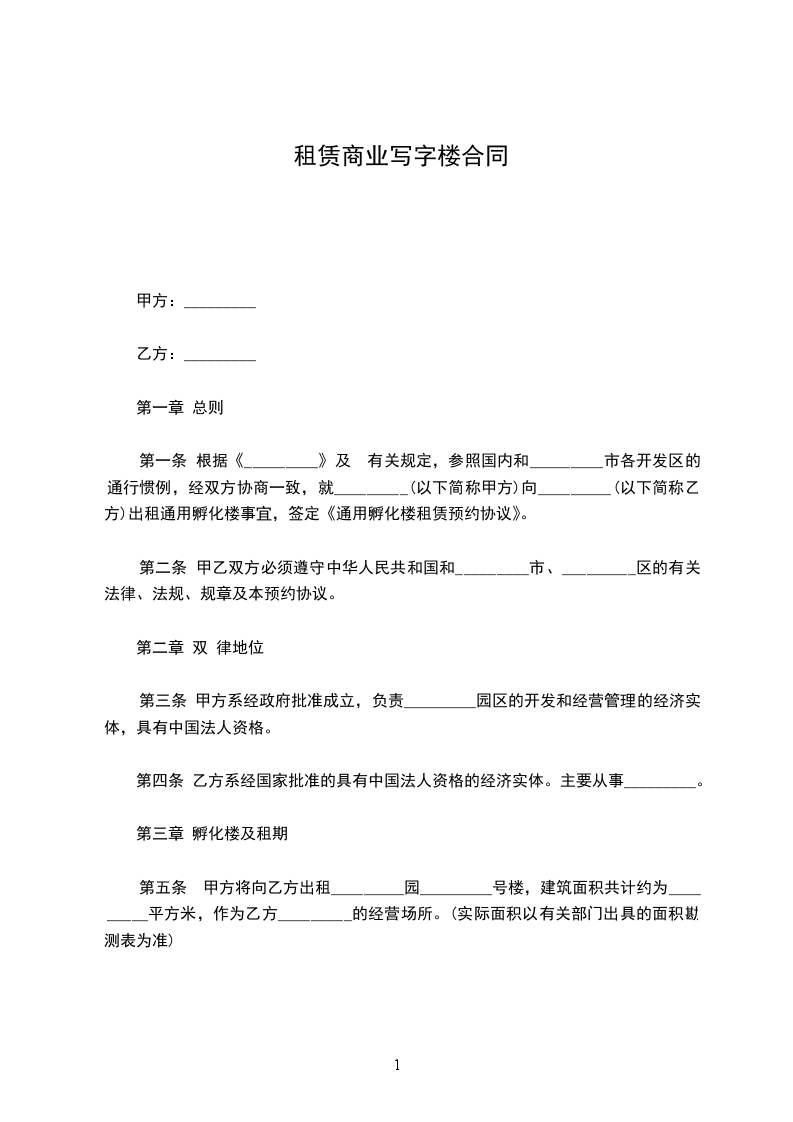 (一) 业主将_____街/道_____号即_____大厦/楼_____座_____楼租与租客,双方订定租金每月人民币_____拾_____万_____仟_____佰_____拾_____元正(收租时另给收据为凭)及订明租用_____年,由_____年_____月_____日起至_____年_____月_____日止。规定租客在生用期内不得退租,否则按照所余租期之时间赔偿租金。保证业主收到原定租期的全。保证业主收到原定租期的全部租金。