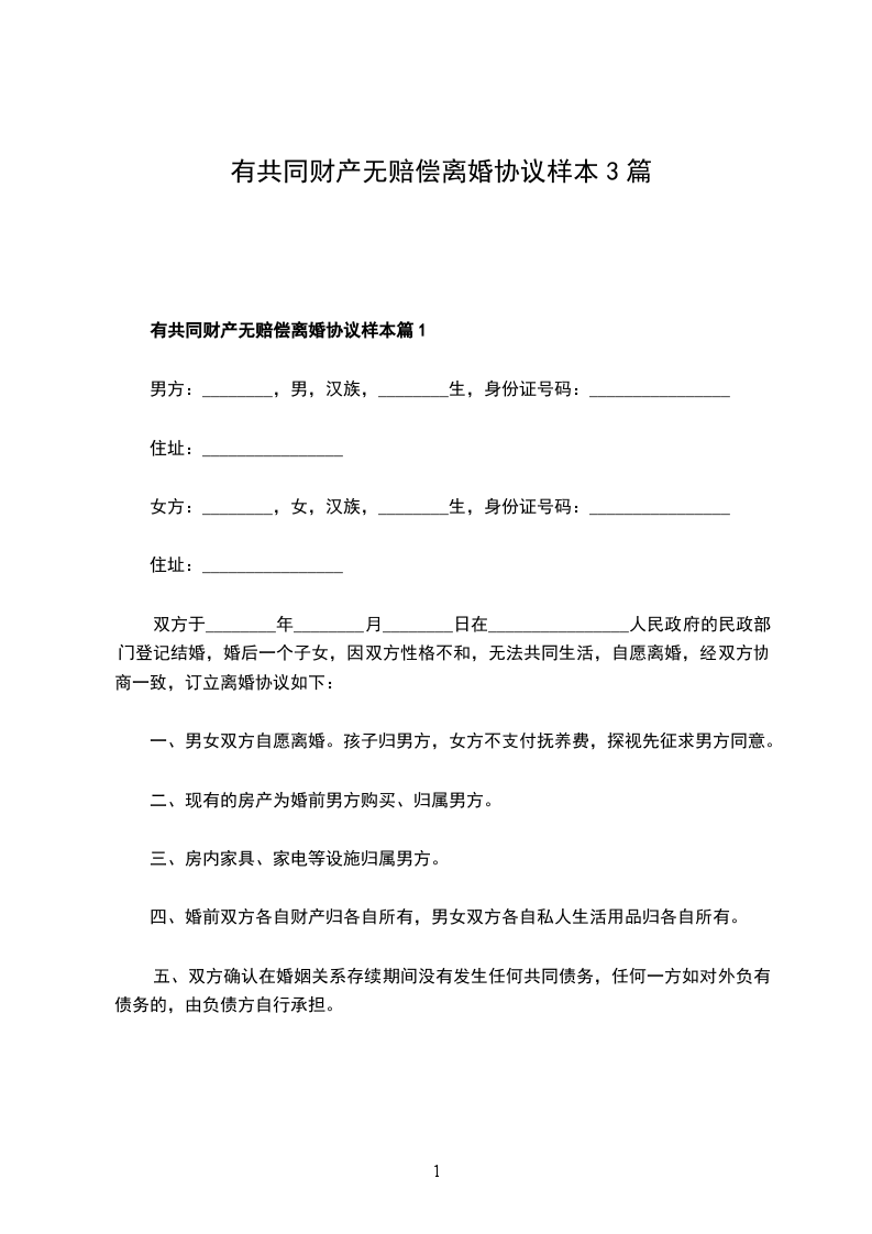 双方于________年________月________日在________________人民政府的民政部门登记结婚,婚后一个子女,因双方性格不和,无法共同生活,自愿离婚,经双方协商一致,订立离婚协议如下: