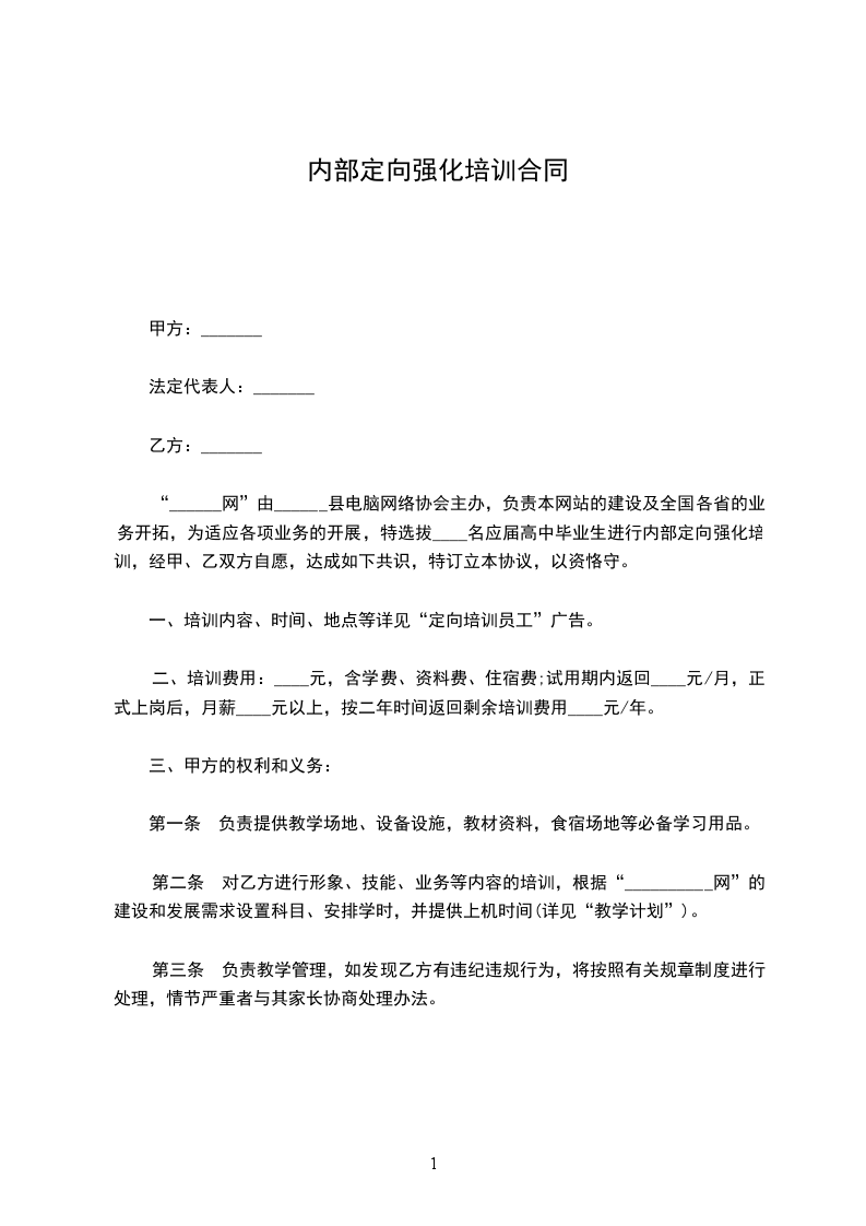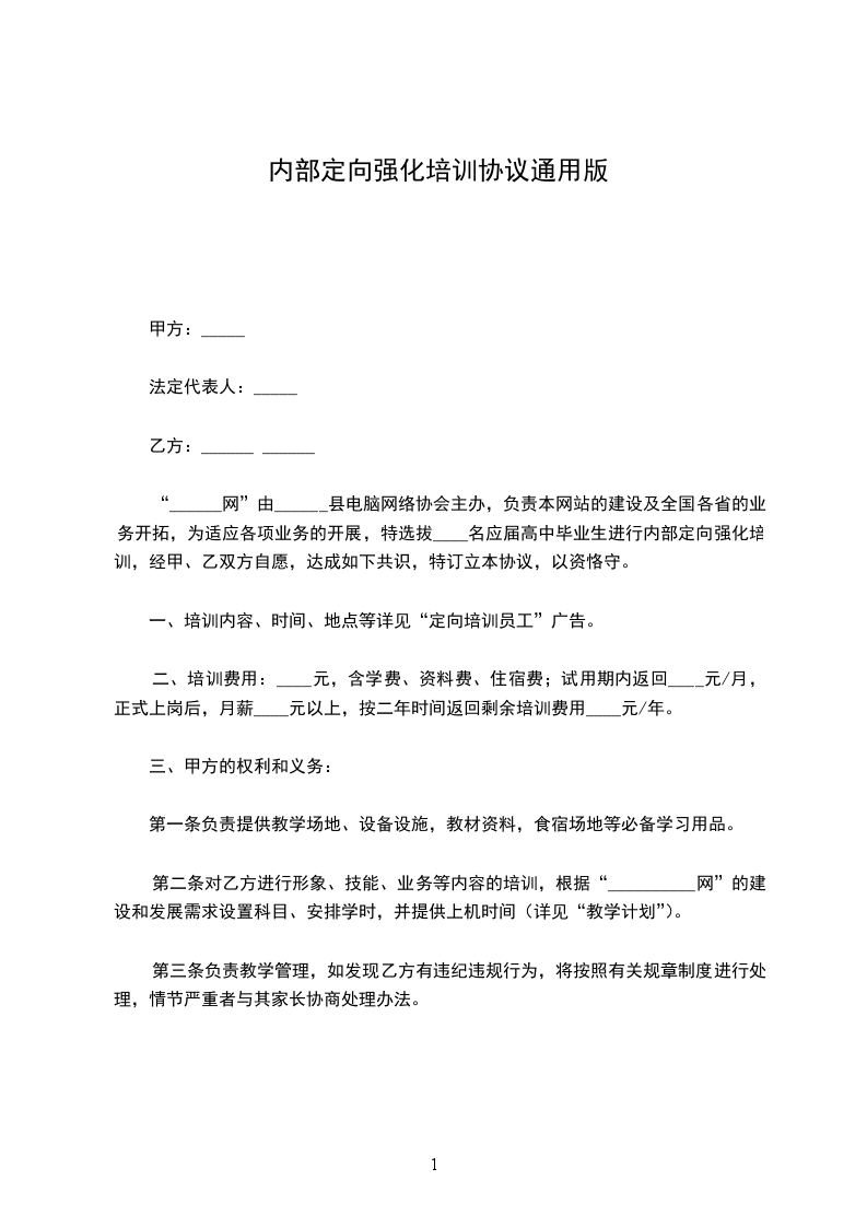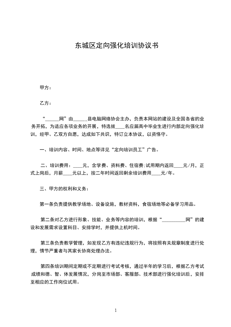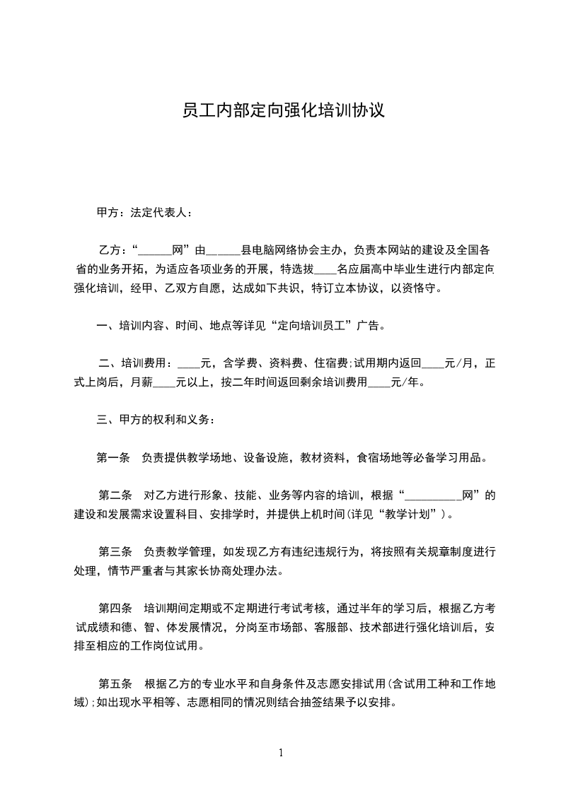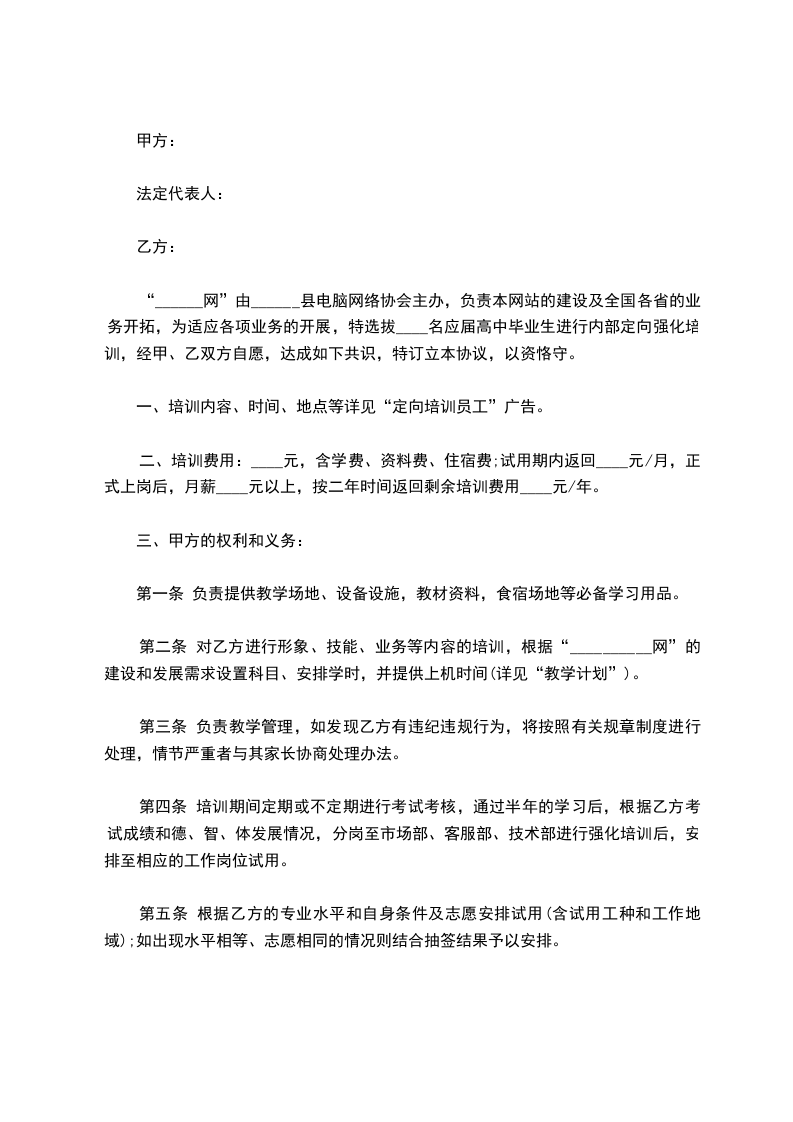 “______网”由______县电脑网络协会主办,负责本网站的建设及全国各省的业务开拓,为适应各项业务的开展,特选拔____名应届高中毕业生进行内部定向强化培训,经甲、乙双方自愿,达成如下共识,特订立本协议,以资恪守。
