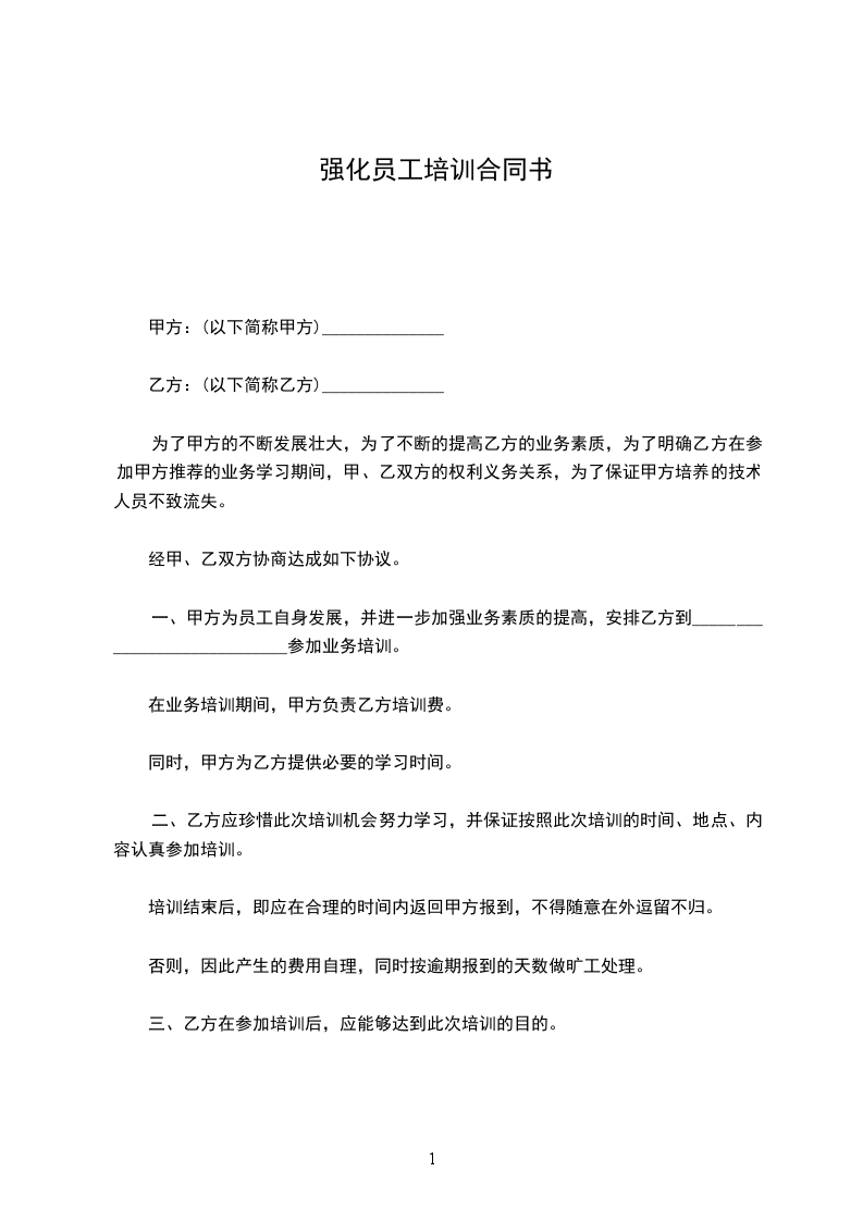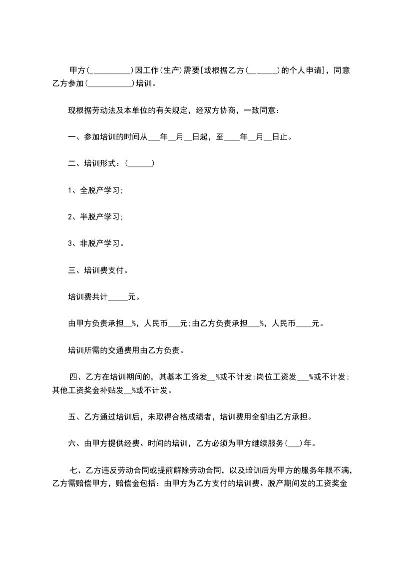 第七条 乙方在试用期内,如考核不合格,将被辞退,剩余的培训费用甲方不予退回(详见“员工试用协议”);如能按时完成甲方交办的各项任务,并考核合格,则签订“员工上岗合同”,月薪____元以上,甲方按年度返回乙方剩余培训费用____元/年(详见“员工上岗合同”)。