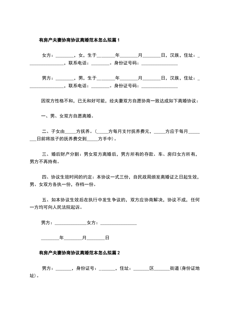 (1)夫妻婚后共有房屋坐落在__________________住房一套。现协商该套房产归______方所有,______方同意在办理完离婚手续后配合______方办理产权变更手续。