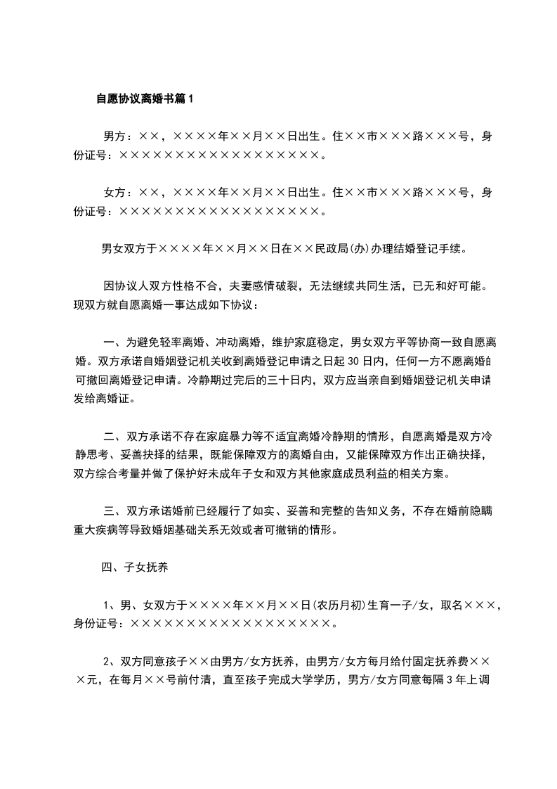 双方于________年________月________日在________________人民政府的民政部门登记结婚,婚后一个子女,因双方性格不和,无法共同生活,自愿离婚,经双方协商一致,订立离婚协议如下: