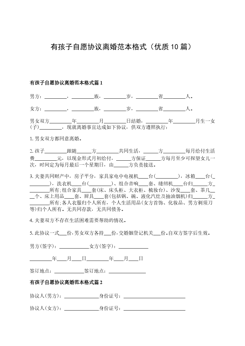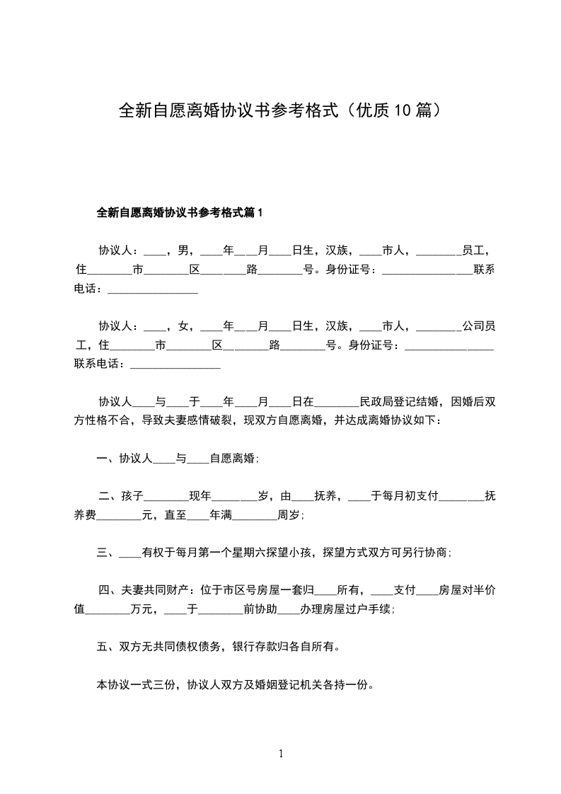 九、本协议一式________份,自婚姻登记处颁发离婚证之日起生效,男、女双方各执________份,婚姻登记机关存档一份。