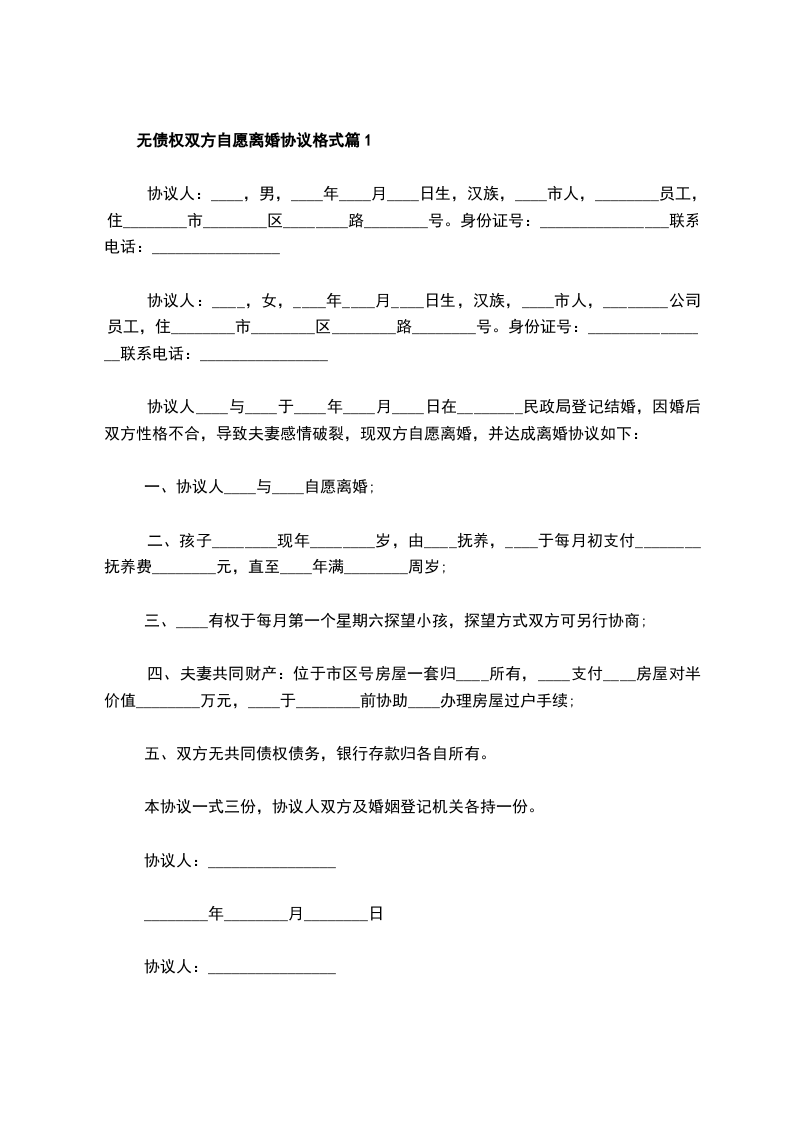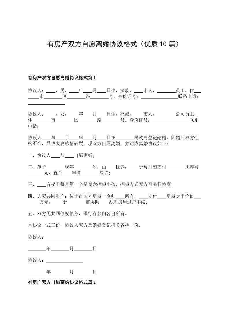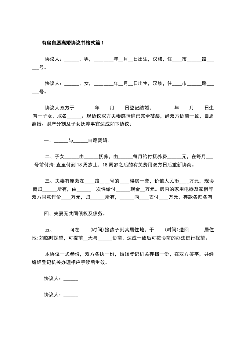 有房自愿离婚协议书格式篇10