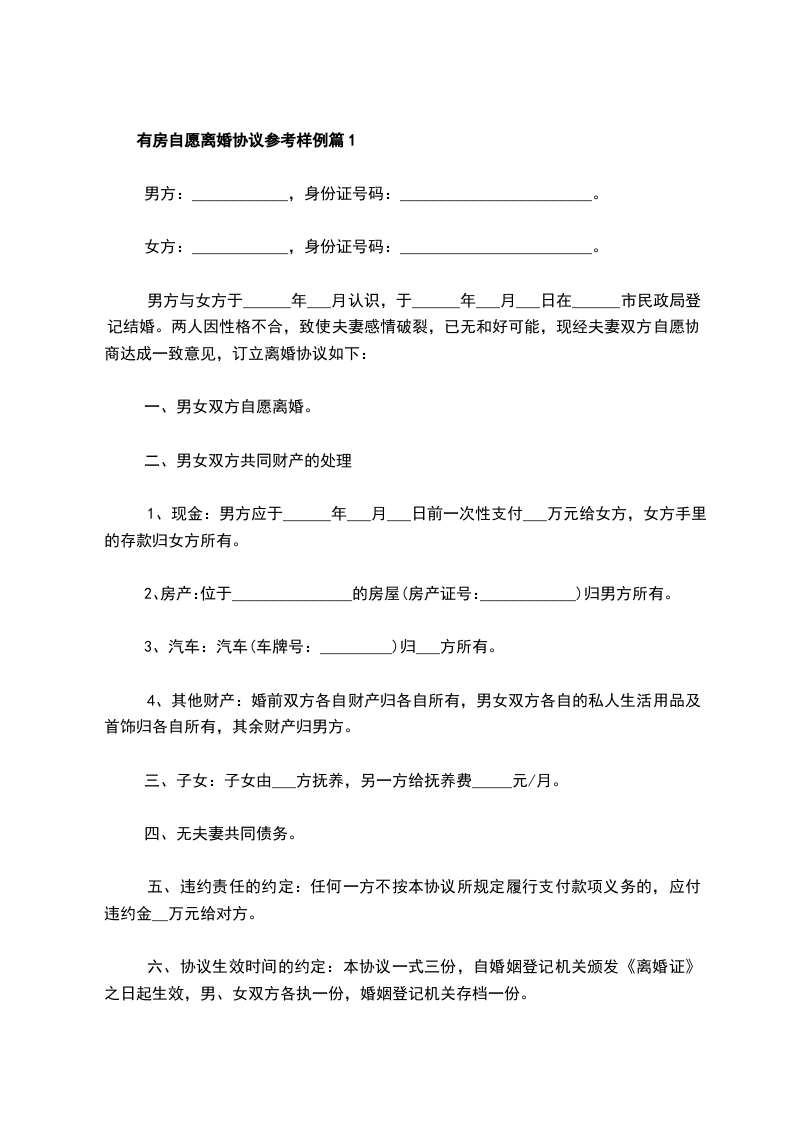 有房自愿离婚协议参考样例篇1