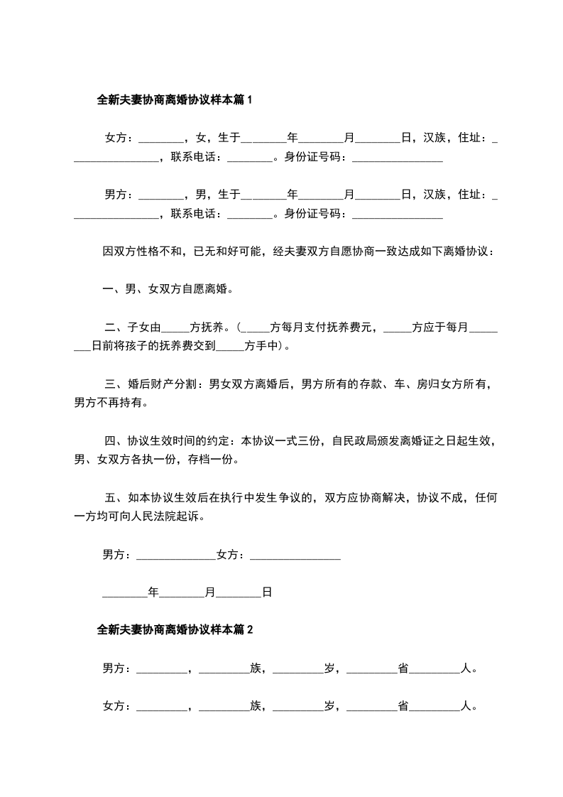 因性格不合、常年吵架致使夫妻感情破裂,已无和好可能。现经夫妻双方自愿协商达成一致意见,订立离婚协议如下: