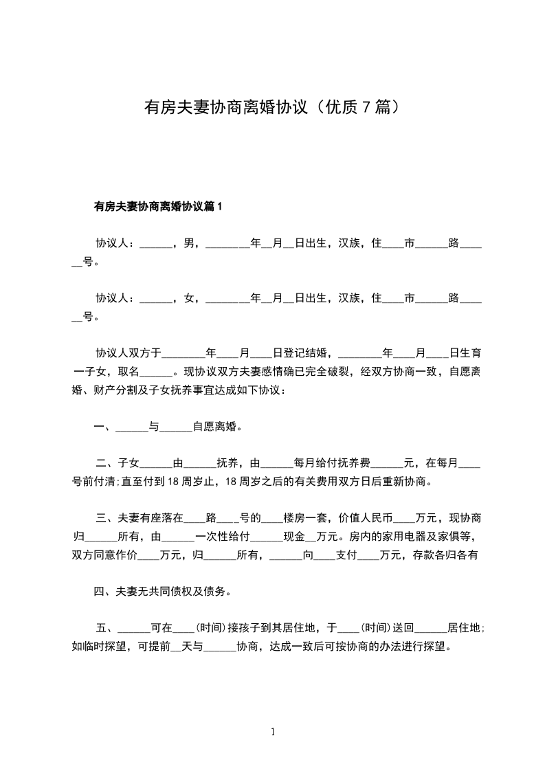 三、夫妻有座落在____路____号的____楼房一套,价值人民币____万元,现协商归______所有,由______一次性给付______现金__万元。房内的家用电器及家俱等,双方同意作价____万元,归______所有,______向____支付____万元,存款各归各有。
