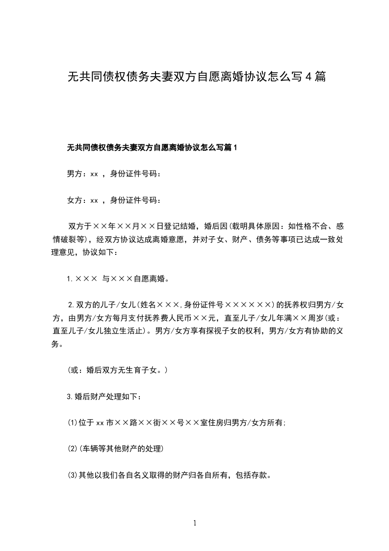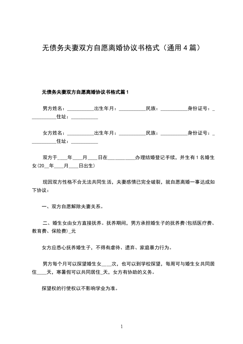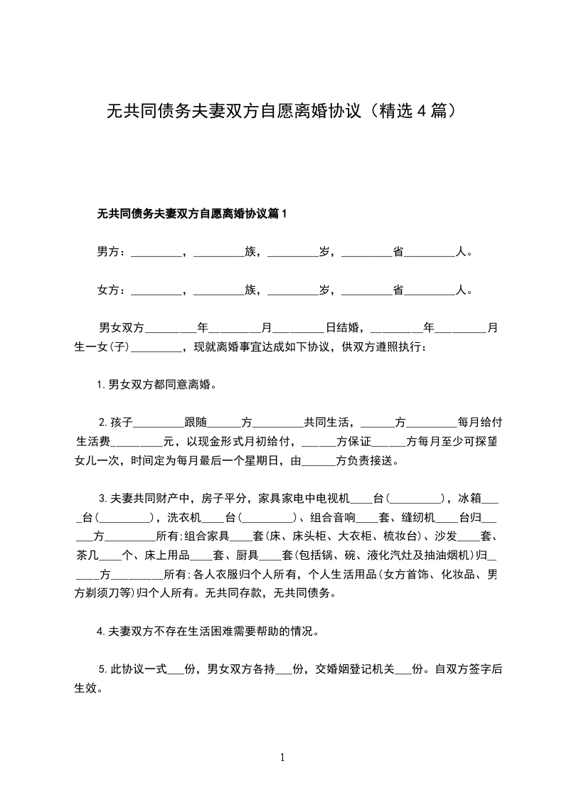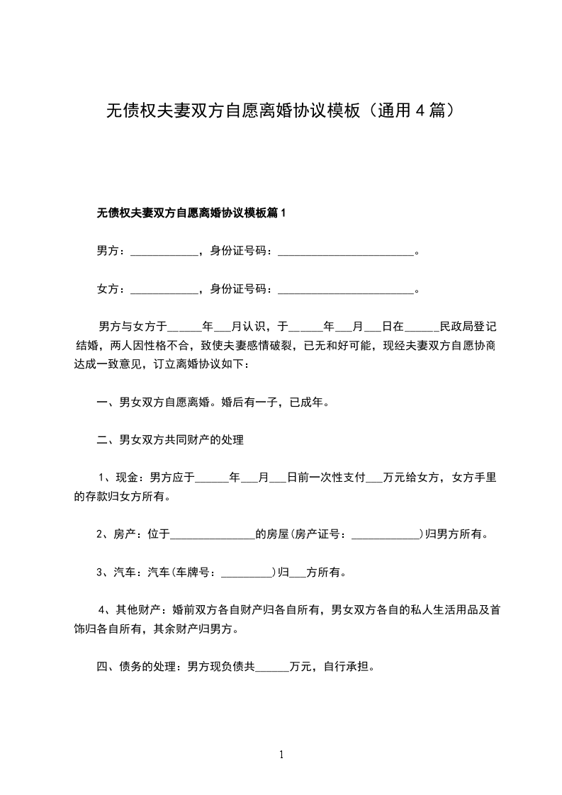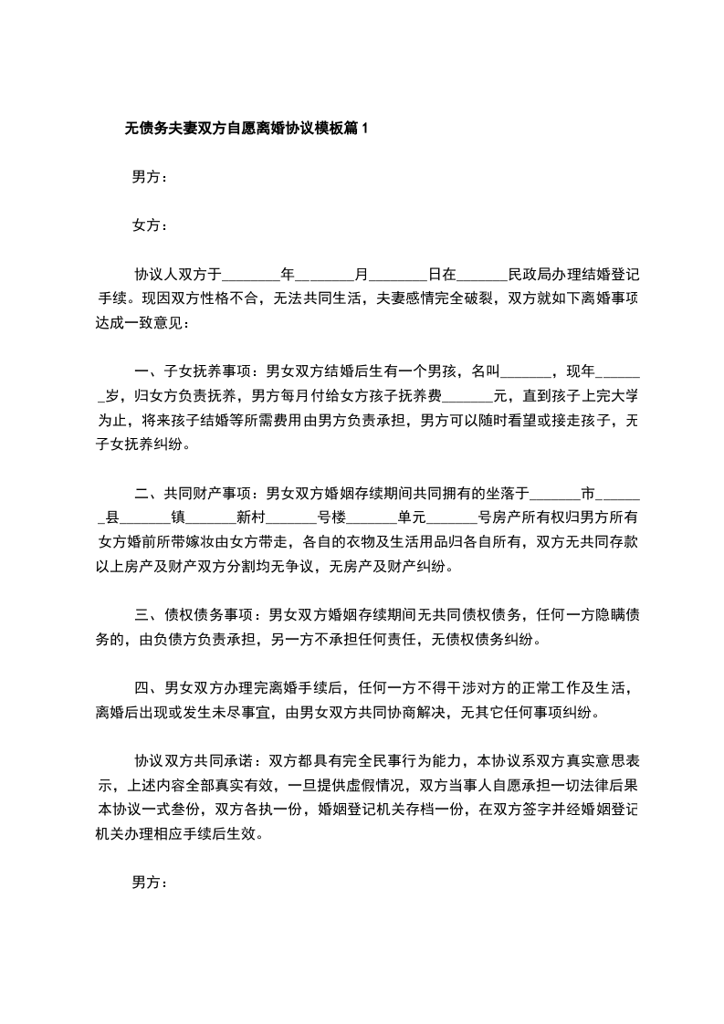 无债务夫妻双方自愿离婚协议模板篇1