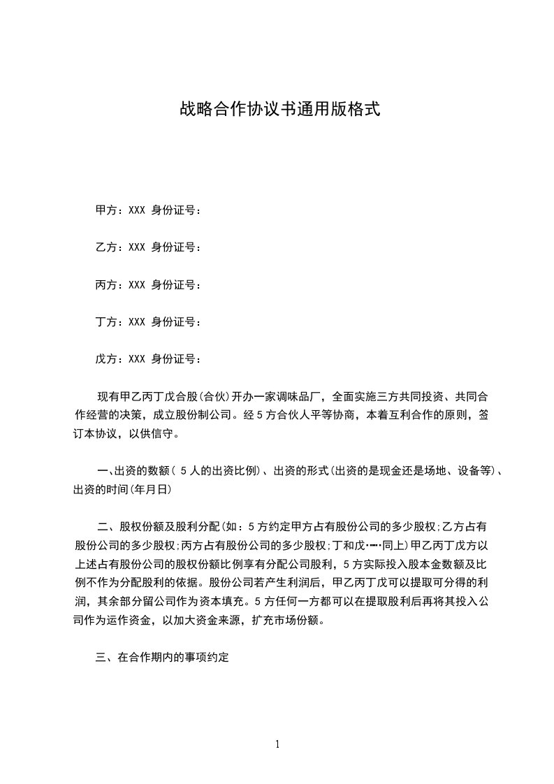 现有甲乙丙丁戊合股(合伙)开办一家调味品厂,全面实施三方共同投资、共同合作经营的决策,成立股份制公司。经5方合伙人平等协商,本着互利合作的原则,签订本协议,以供信守。
