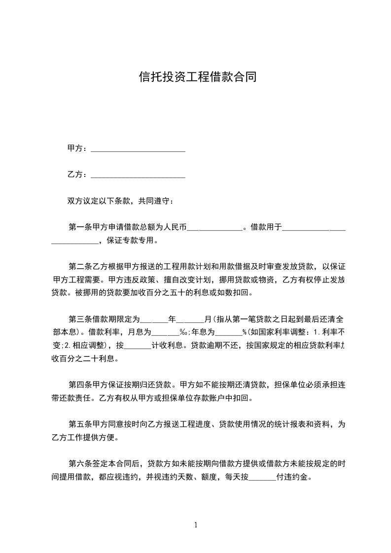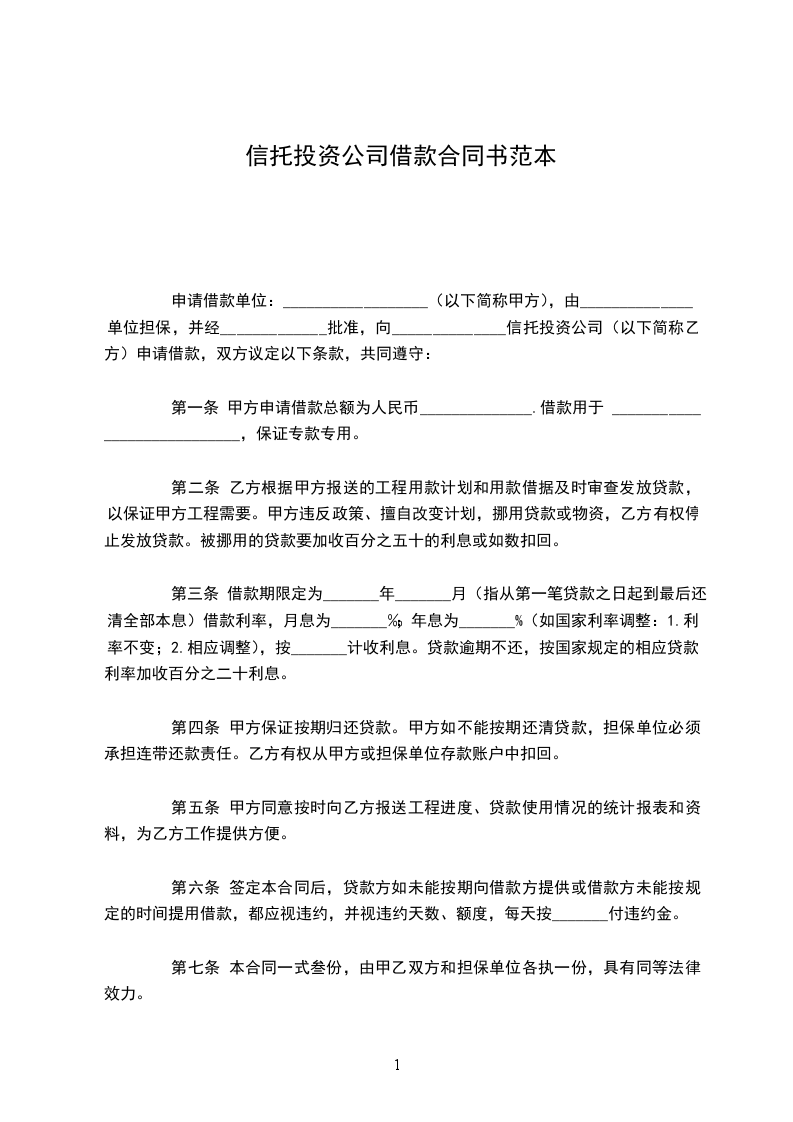 申请借款单位:__________________(以下简称甲方),由______________单位担保,并经_____________批准,向______________信托投资公司(以下简称乙方)申请借款,双方议定以下条款,共同遵守: