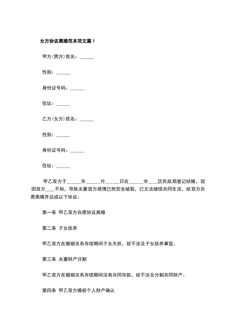 1、双方于___年___月___日生育一女儿,取名:____,于____年____月____日生育一儿子,取名:____.离婚后儿子及女儿随男方直接抚养生活。