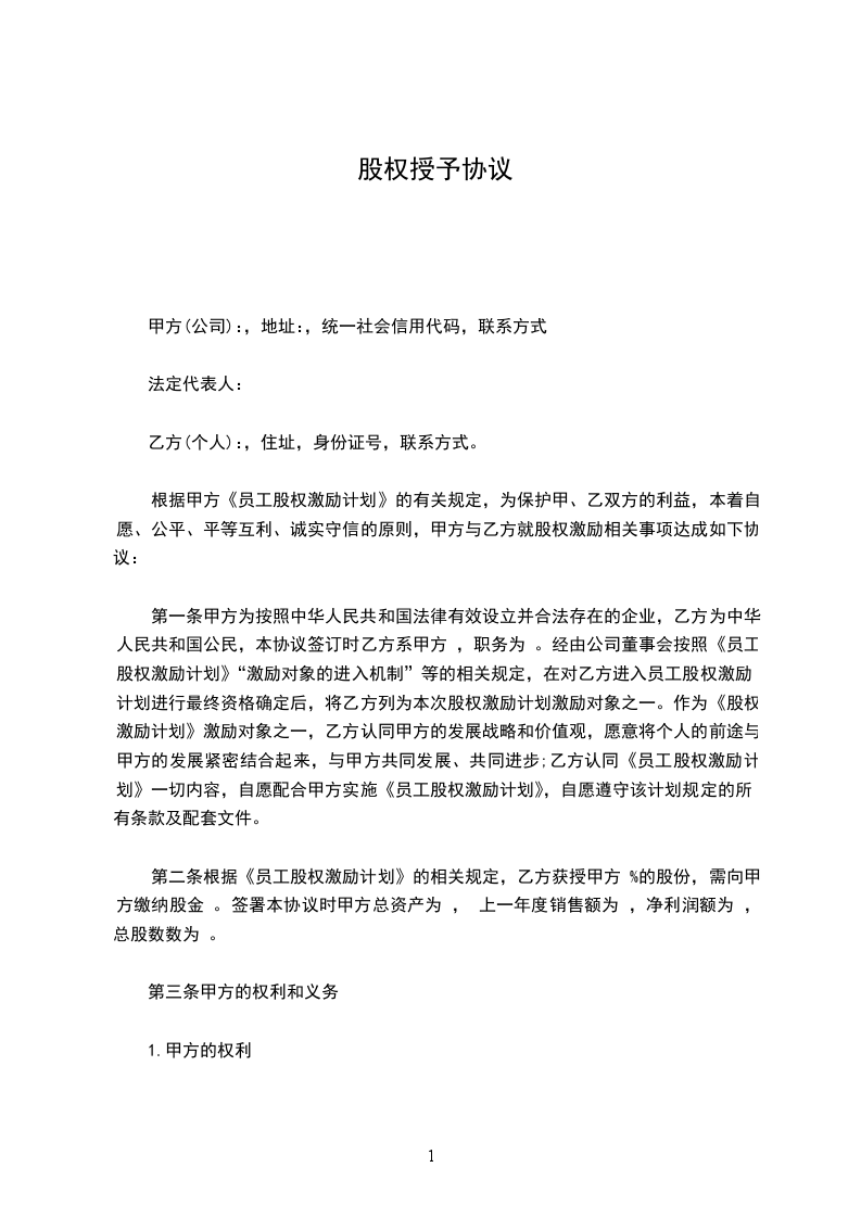 第二条根据《员工股权激励计划》的相关规定,乙方获授甲方 %的股份,需向甲方缴纳股金 。签署本协议时甲方总资产为 , 上一年度销售额为 ,净利润额为 ,总股数数为 。