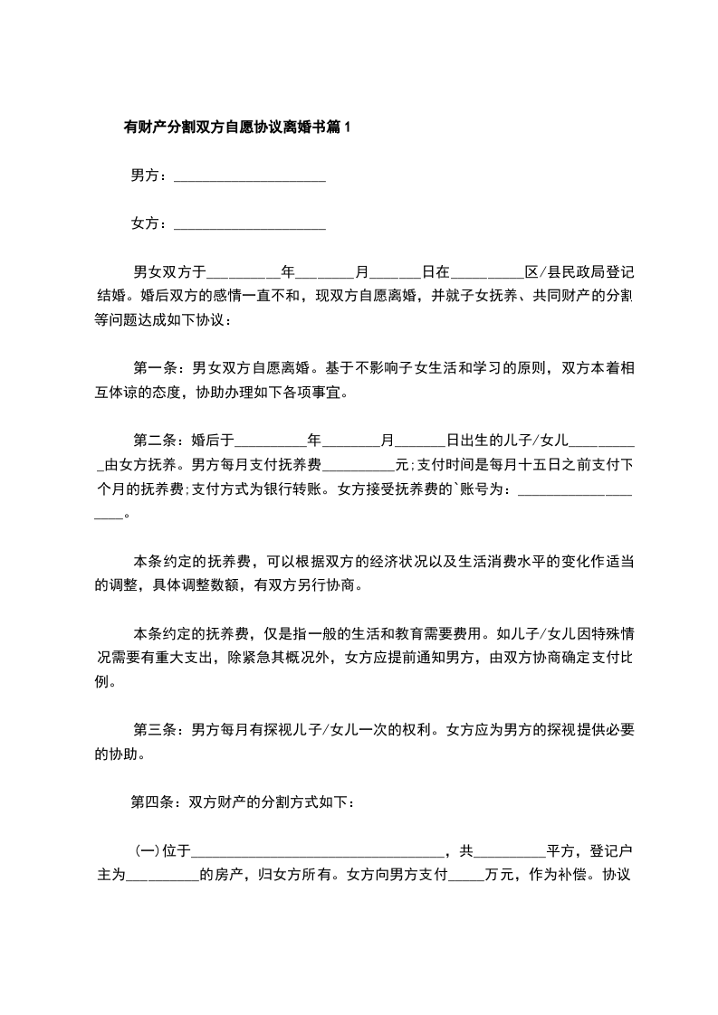 有财产分割双方自愿协议离婚书篇2