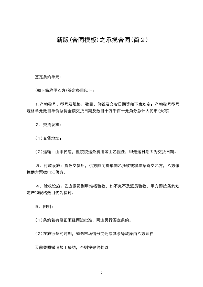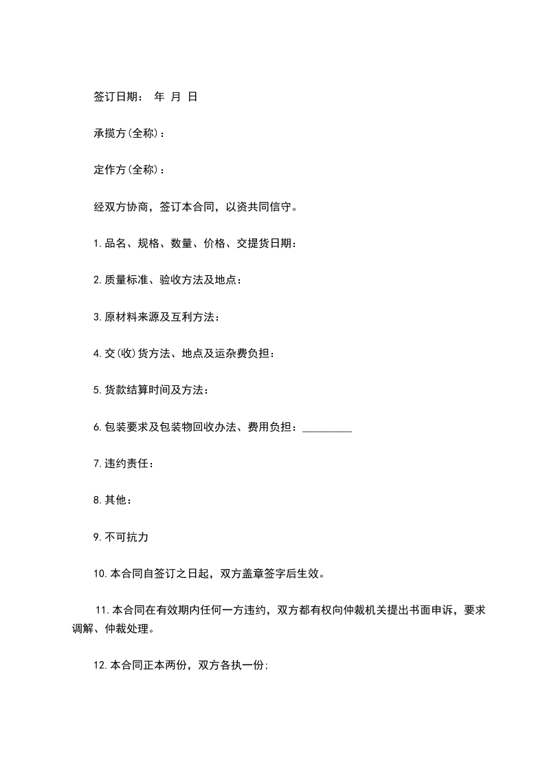 (2)在执行合同期间,如遇市场情况变化或其他原因乙方须在____天前通知撤销加工合同,否则按违约处以______罚金赔偿对方损失。
