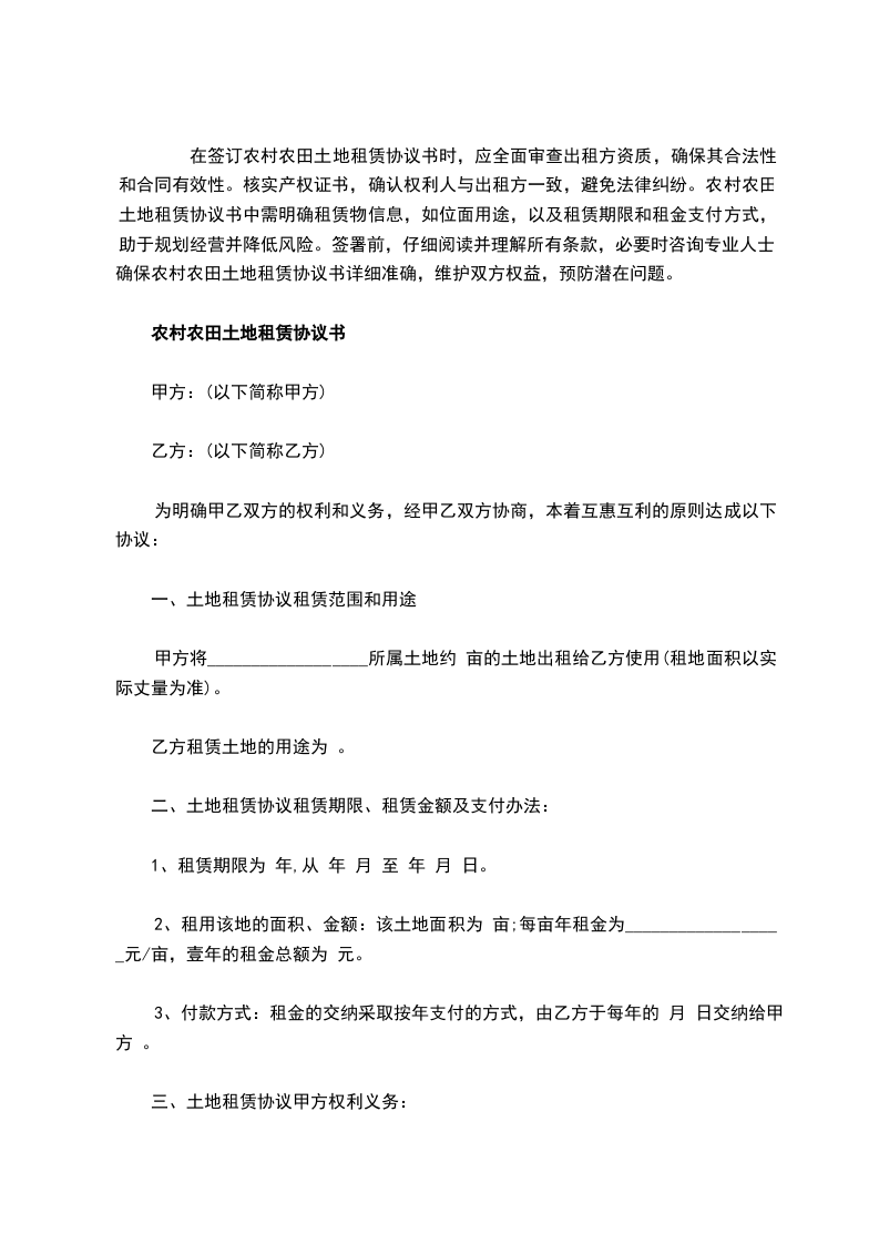 按照先缴费后使用,一年一交,三年一议价的方式缴纳租赁费,租赁费头两年每年800元/亩,于每年_____月_____日前将下一年租赁费以现金方式全部结清,_____年至_____年租赁费为_____元/年、__________亩。三年重新议价时,不涉及经营权变更。