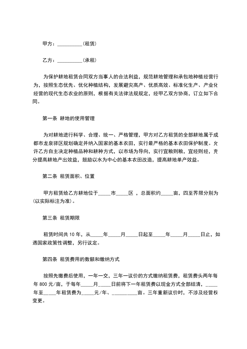 为保护耕地租赁合同双方当事人的合法利益,规范耕地管理和承包地种植经营行为,按照生态优先、优化种植结构,发展避灾高产、优质高效、标准化生产、产业化经营的现代生态农业的原则,根据有关法律法规规定,经甲乙双方协商,订立如下合同。