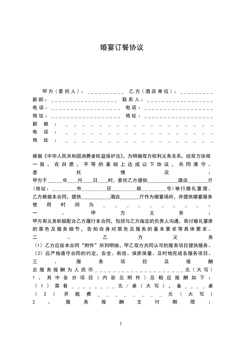 甲方于______年____月____日____时,委托乙方提供____________酒店________厅(地址:________市________区________路________号)举行婚礼宴席。