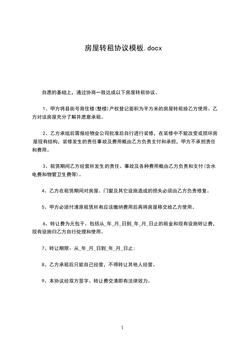 1、甲、乙双方约定,甲方于__年__月__日前向乙方交付该房屋。转租期为__个月。自__年__月__日起至__年__月__日止。甲方保证该转租期限未超出____(租赁合同/前一个转租合同)的租期。