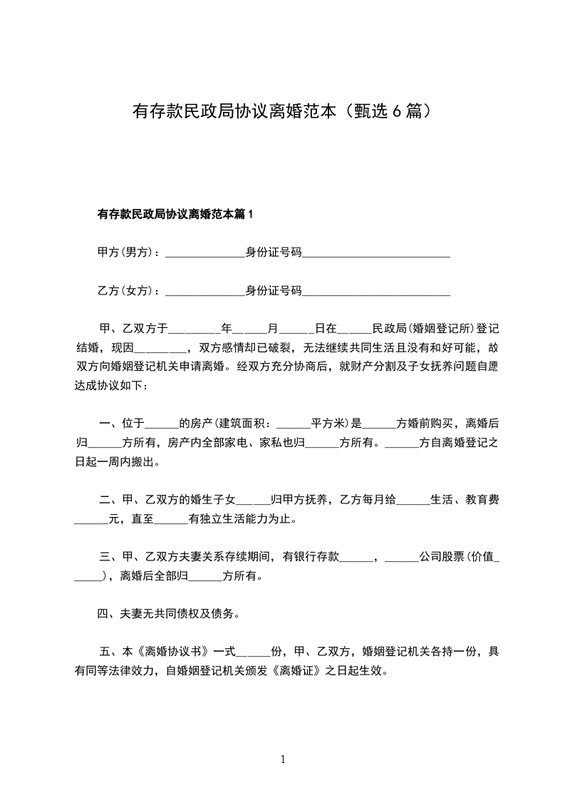 1、 存款:双方确认共同存款 元人民币(大写: ),双方约定于___年___月___日前,甲方分得 元人民币(大写: ),乙方分得 元人民币(大写:);