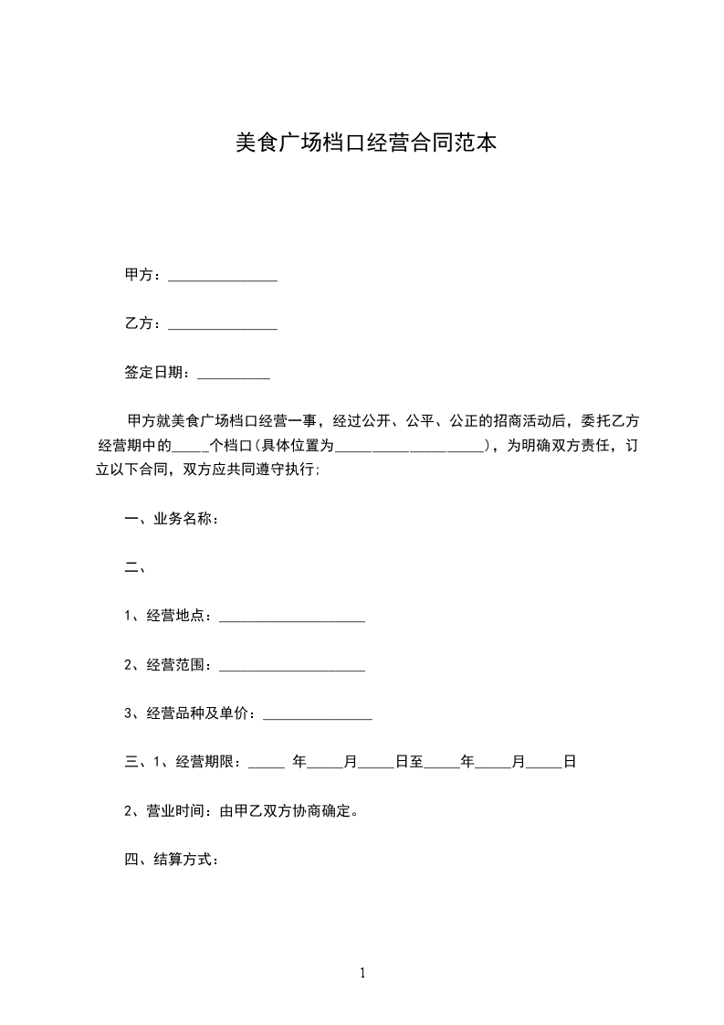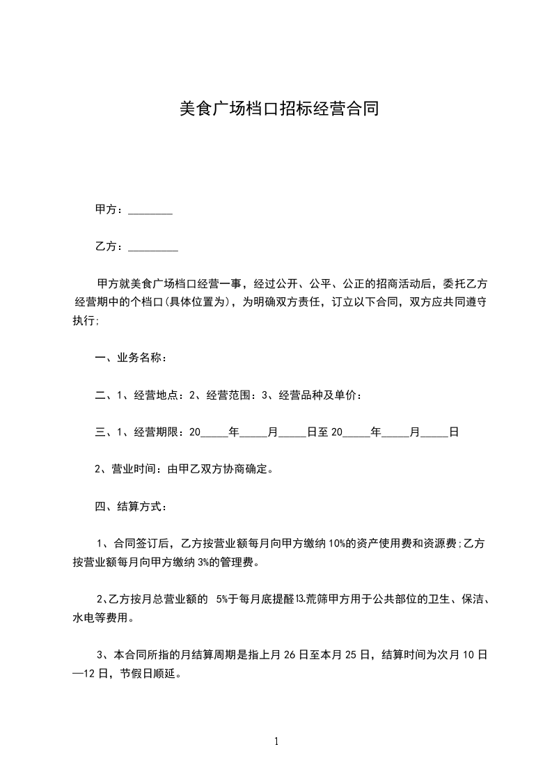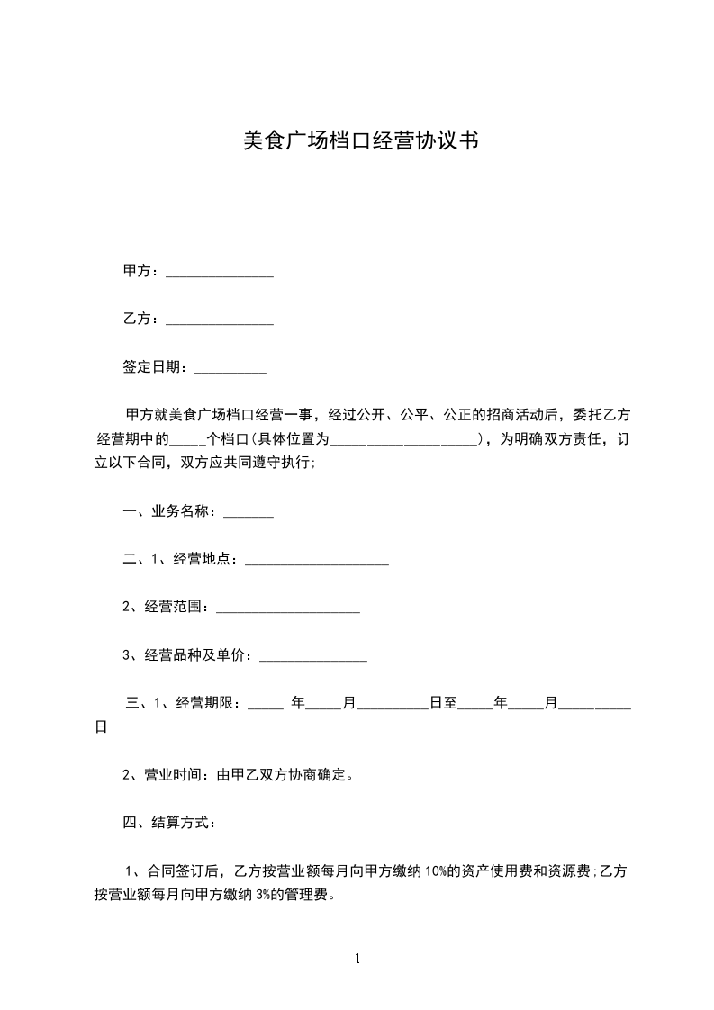 甲方就美食广场档口经营一事,经过公开、公平、公正的招商活动后,委托乙方经营期中的_____个档口(具体位置为____________________),为明确双方责任,订立以下合同,双方应共同遵守执行;