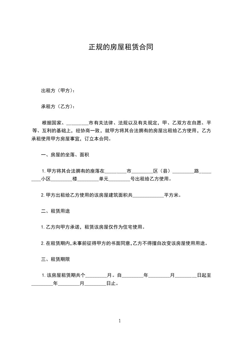 1.甲方将其合法拥有的座落在_________市_________区(县)_________路_________小区_________楼_________单元_________号出租给乙方使用。