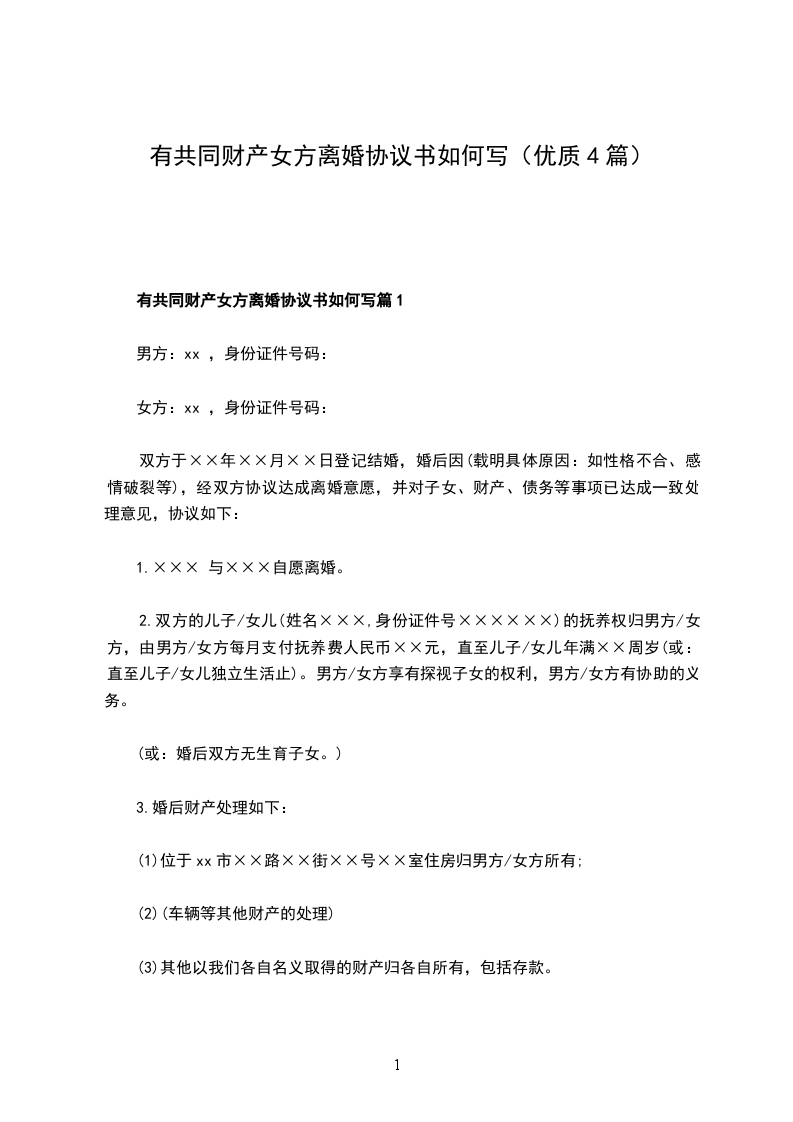 三、夫妻有座落在______路______号的______楼房一套,价值人民币6万元,现协商归女方所有,由女方一次性给付男方现金3万元。房内的家用电器及家俱等等(见清单),双方同意作价2万元,归女方所有,女方向男方支付1万元。无其他共同存款。