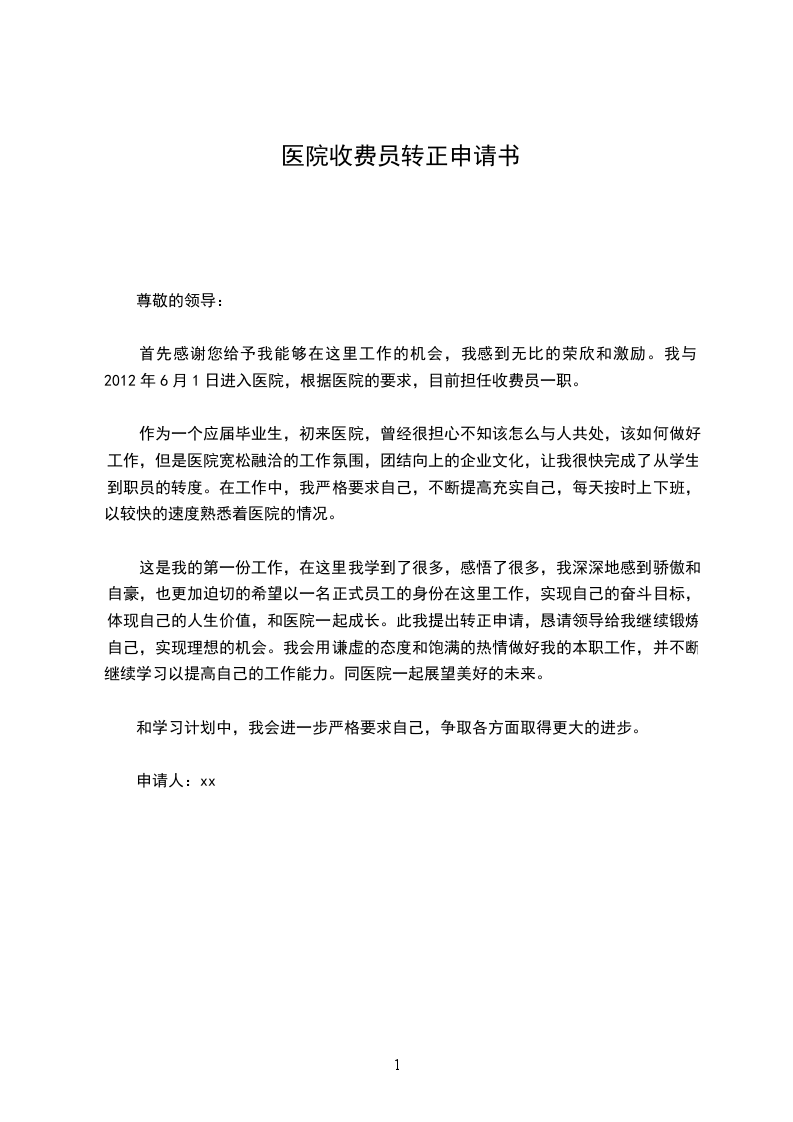 这是我的第一份工作,在这里我学到了很多,感悟了很多,我深深地感到骄傲和自豪,也更加迫切的希望以一名正式员工的身份在这里工作,实现自己的奋斗目标,体现自己的人生价值,和医院一起成长。此我提出转正申请,恳请领导给我继续锻炼自己,实现理想的机会。我会用谦虚的态度和饱满的热情做好我的本职工作,并不断继续学习以提高自己的工作能力。同医院一起展望美好的未来。