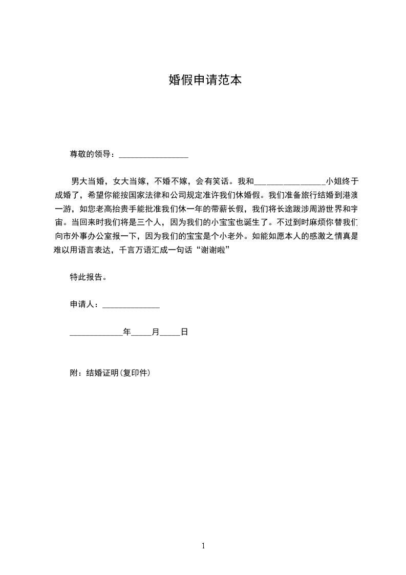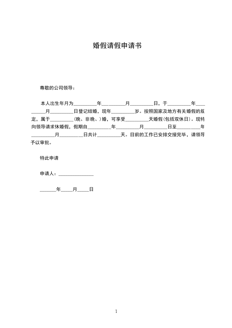 本人于XXXX年X月X日登记结婚,并属于晚婚。根据国家有关婚假规定,本人可享受x天婚假。现特向领导请求休婚假,自X月X日到X月X日共计X天,请予以审批。