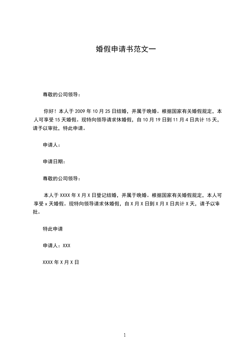 你好!本人于2009年10月25日结婚,并属于晚婚。根据国家有关婚假规定,本人可享受15天婚假。现特向领导请求休婚假,自10月19日到11月4日共计15天,请予以审批,特此申请。