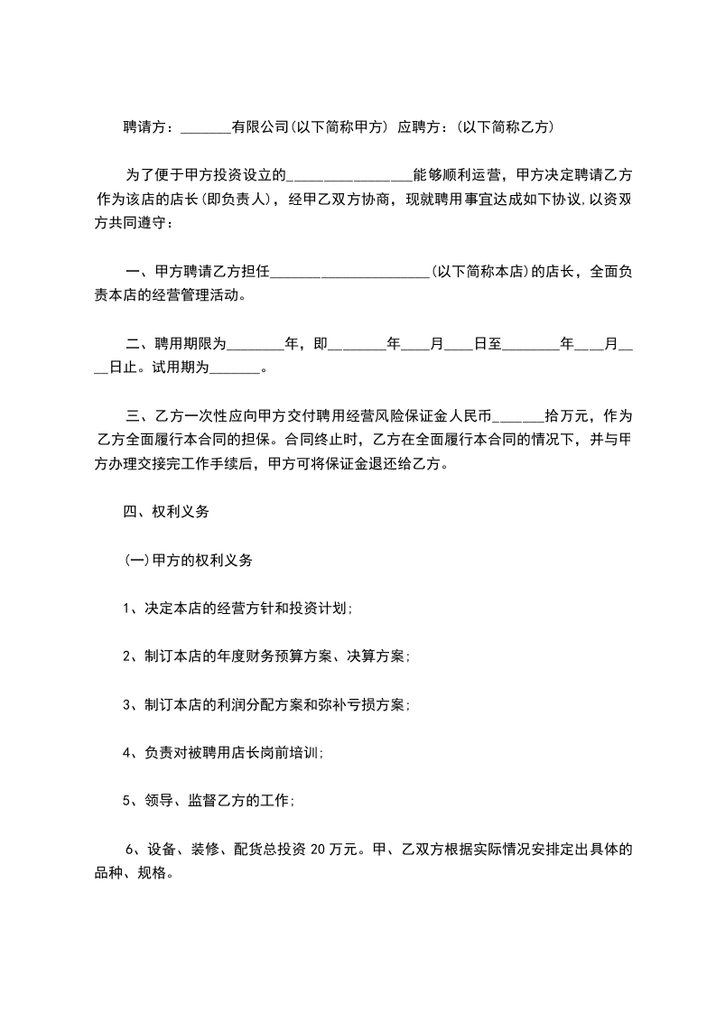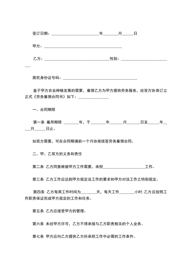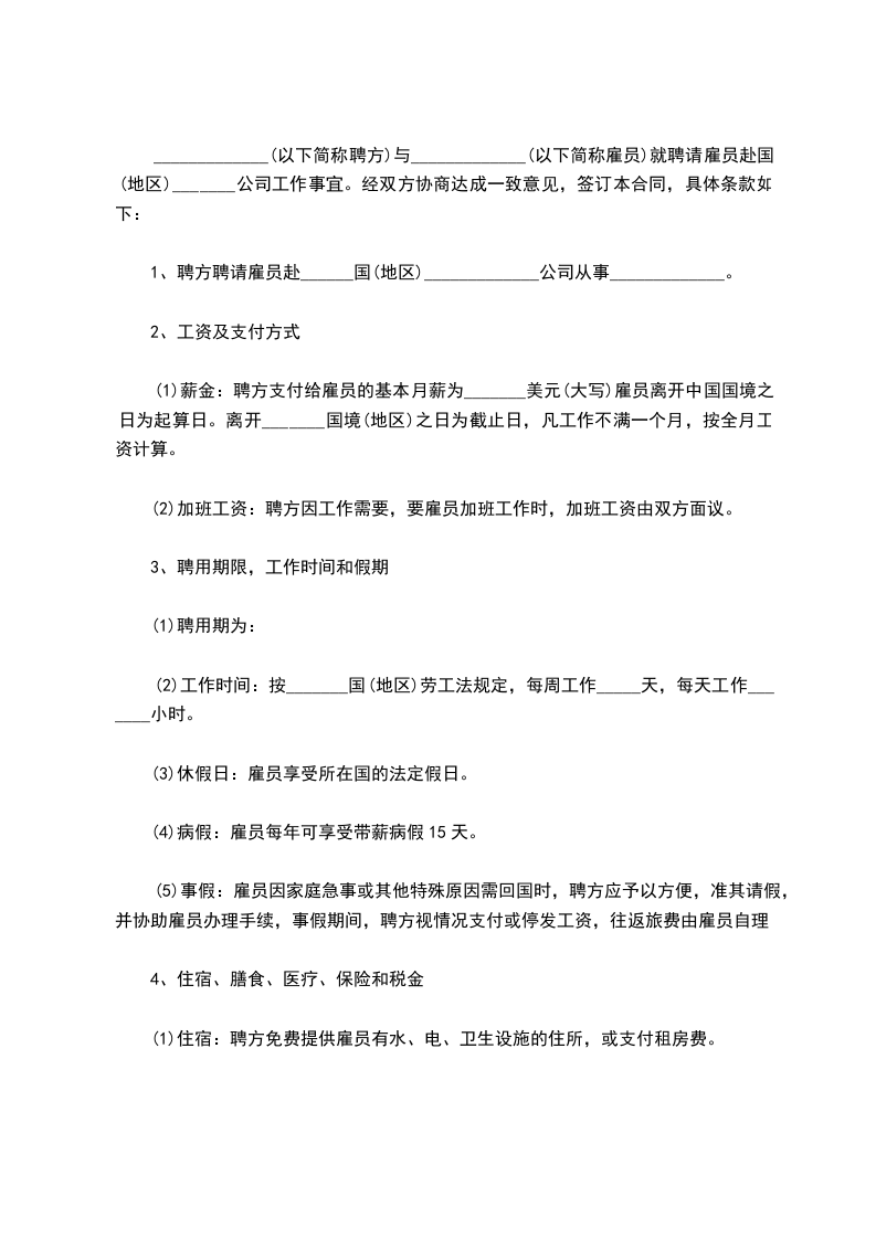 _____________(以下简称聘方)与_____________(以下简称雇员)就聘请雇员赴国(地区)_______公司工作事宜。经双方协商达成一致意见,签订本合同,具体条款如下: