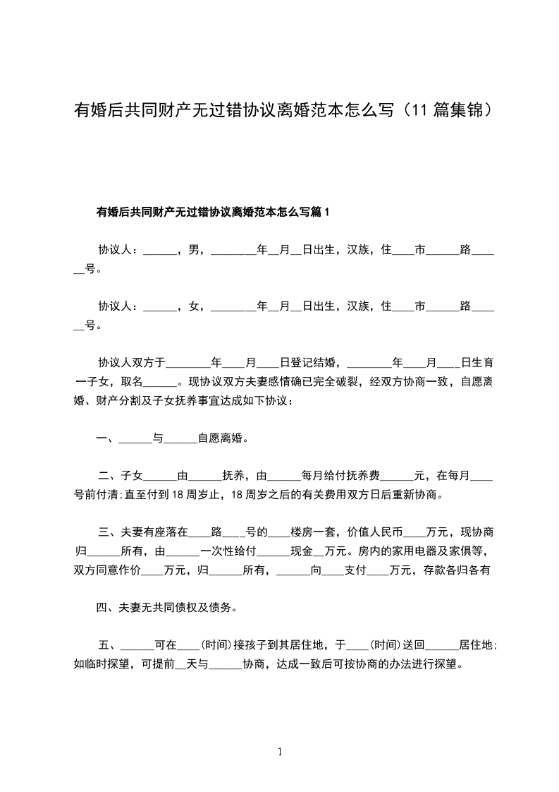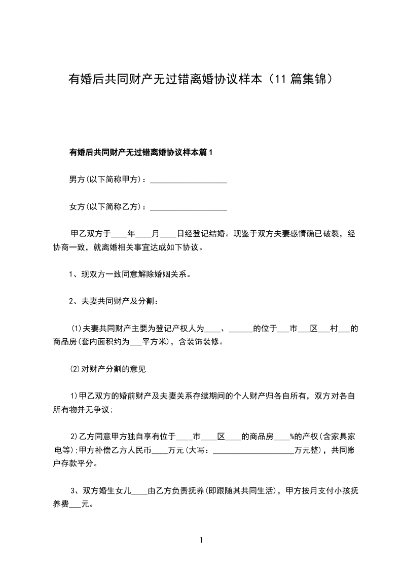 有婚后共同财产无过错离婚协议样本篇11