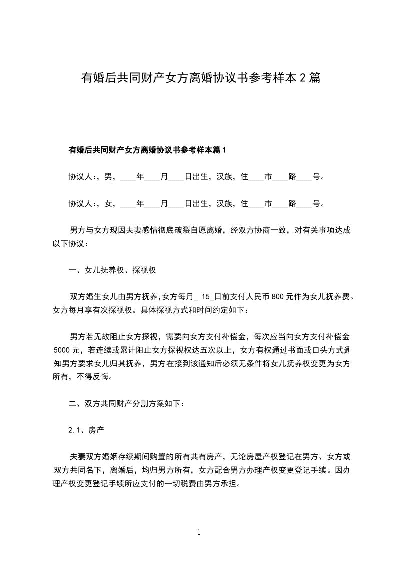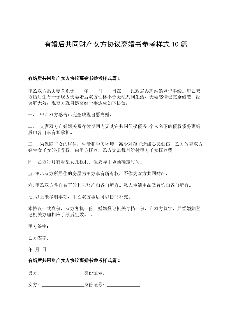 有婚后共同财产女方离婚协议参考样式篇2
