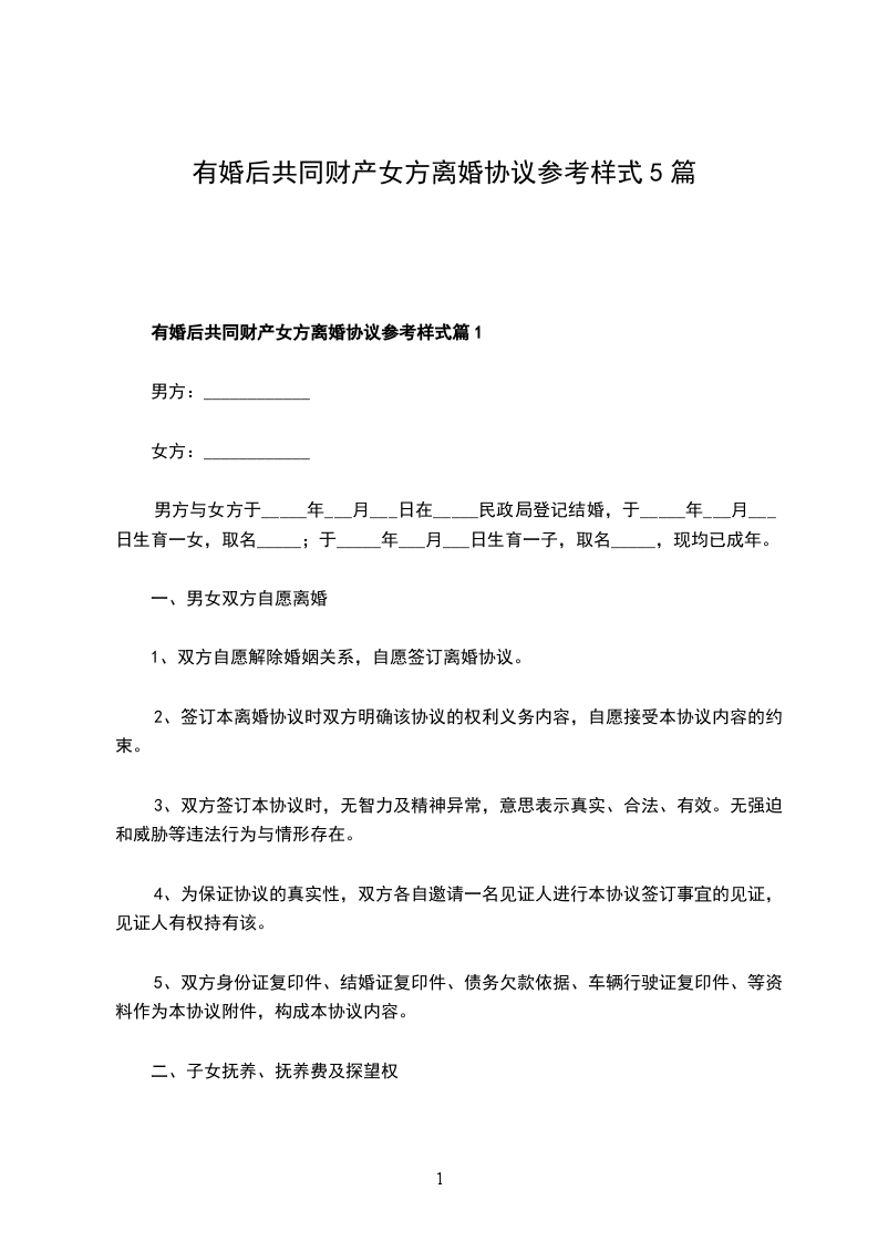 有婚后共同财产女方离婚协议参考样式篇5
