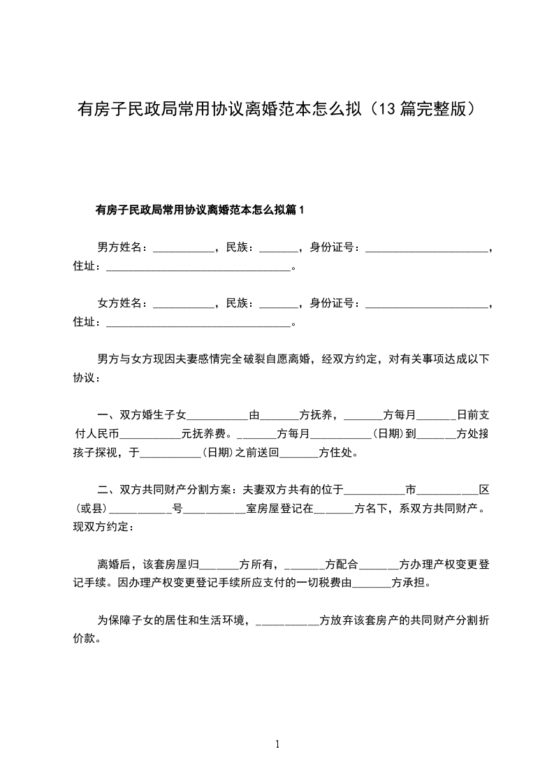 2、【房产】双方有夫妻共同财产座落在××路××小区××室商品房一套,价值人民币×××××万元,现协商归男方/女方所有,由男方/女方一次性给付男方/女方现金×××××万元,此款在本协议签订后的××天内付清;此房内的家用电器及家俱归男方/女方所有。