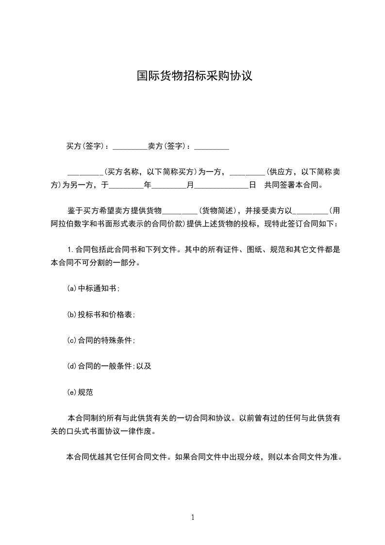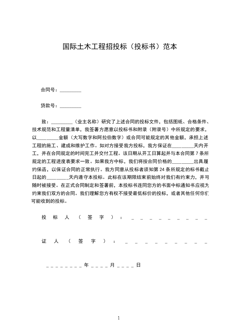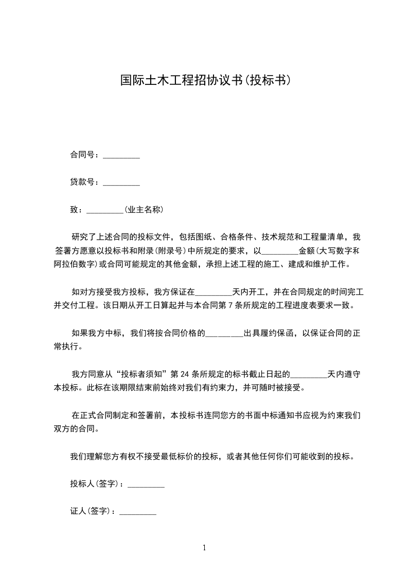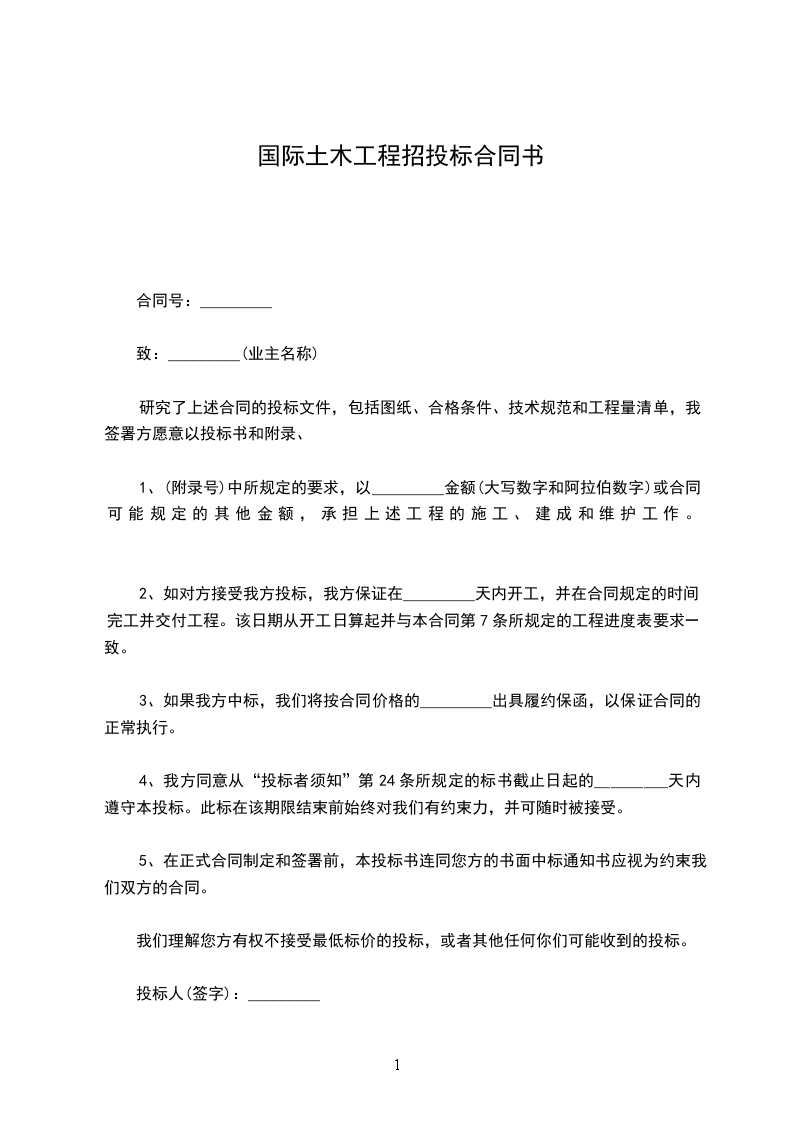 致:_________(业主名称)研究了上述合同的投标文件,包括图纸、合格条件、技术规范和工程量清单,我签署方愿意以投标书和附录(附录号)中所规定的要求,以_________金额(大写数字和阿拉伯数字)或合同可能规定的其他金额,承担上述工程的施工、建成和维护工作。如对方接受我方投标,我方保证在_________天内开工,并在合同规定的时间完工并交付工程。该日期从开工日算起并与本合同第7条所规定的工程进度表要求一致。如果我方中标,我们将按合同价格的_________出具履约保函,以保证合同的正常执行。我方同意从投标者须知第24条所规定的标书截止日起的_________天内遵守本投标。此标在该期限结束前始终对我们有约束力,并可随时被接受。在正式合同制定和签署前,本投标书连同您方的书面中标通知书应视为约束我们双方的合同。我们理解您方有权不接受最低标价的投标,或者其他任何你们可能收到的投标。