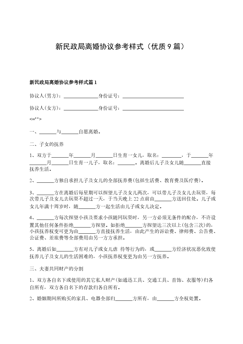 九、本协议一式三份,自婚姻登记处颁发离婚证之日起生效,男、女双方各执一份,婚姻登记机关存档一份。