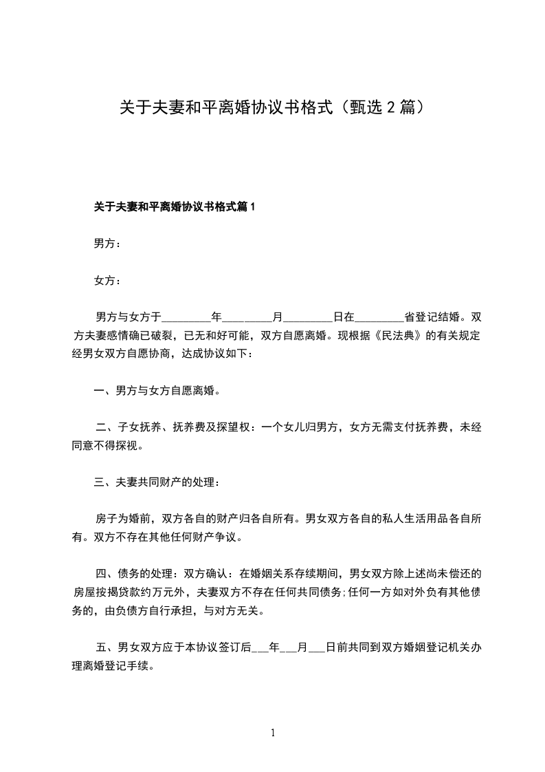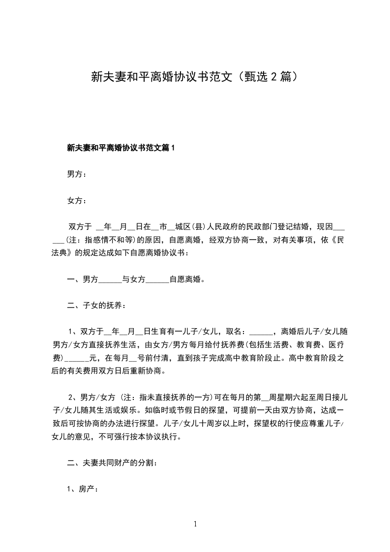 新夫妻和平离婚协议书范文篇1