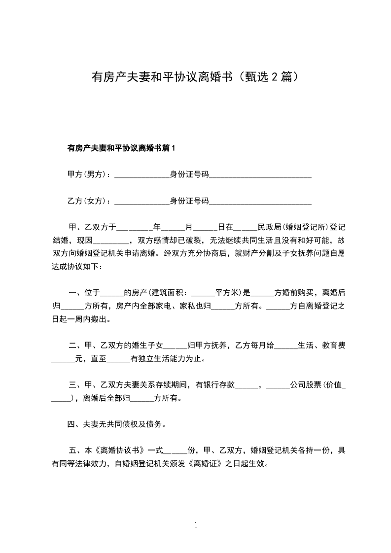 a、夫妻双方婚后购有坐落在__路__号__小区__栋__单元__号的楼房一套,登记在男方/女方(或双方)名下,属夫妻共有财产。离婚后,该套房屋归男方/女方所有 (注:包括房内装修内附属设施及相关配套设施),双方相互配合办理产权变更登记手续。因办理产权变更登记手续所应支付的一切税费等均由男方/女方承担。取得房屋所有权的一方给予另一方经济补偿人民币______元,在本协议签订之日起__日内付清。